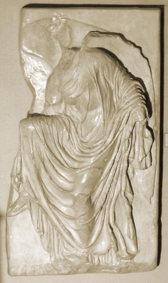 Rendered in high Classical style, the body of the figure is fully visible, but Nike is turned slightly from the viewer, caught in the act of reaching towards the sandal on her right foot with her right hand. She is bent slightly forward, her right foot raised, knee bent, as she reaches to adjust the strap of her sandal. As though from the movement, her voluminous chiton appears to have slipped from her right shoulder, exposing it. The body is in high relief except for her wings, which are in lower relief to give the impression of being in the background. These have suffered some damage and the head is missing entirely.