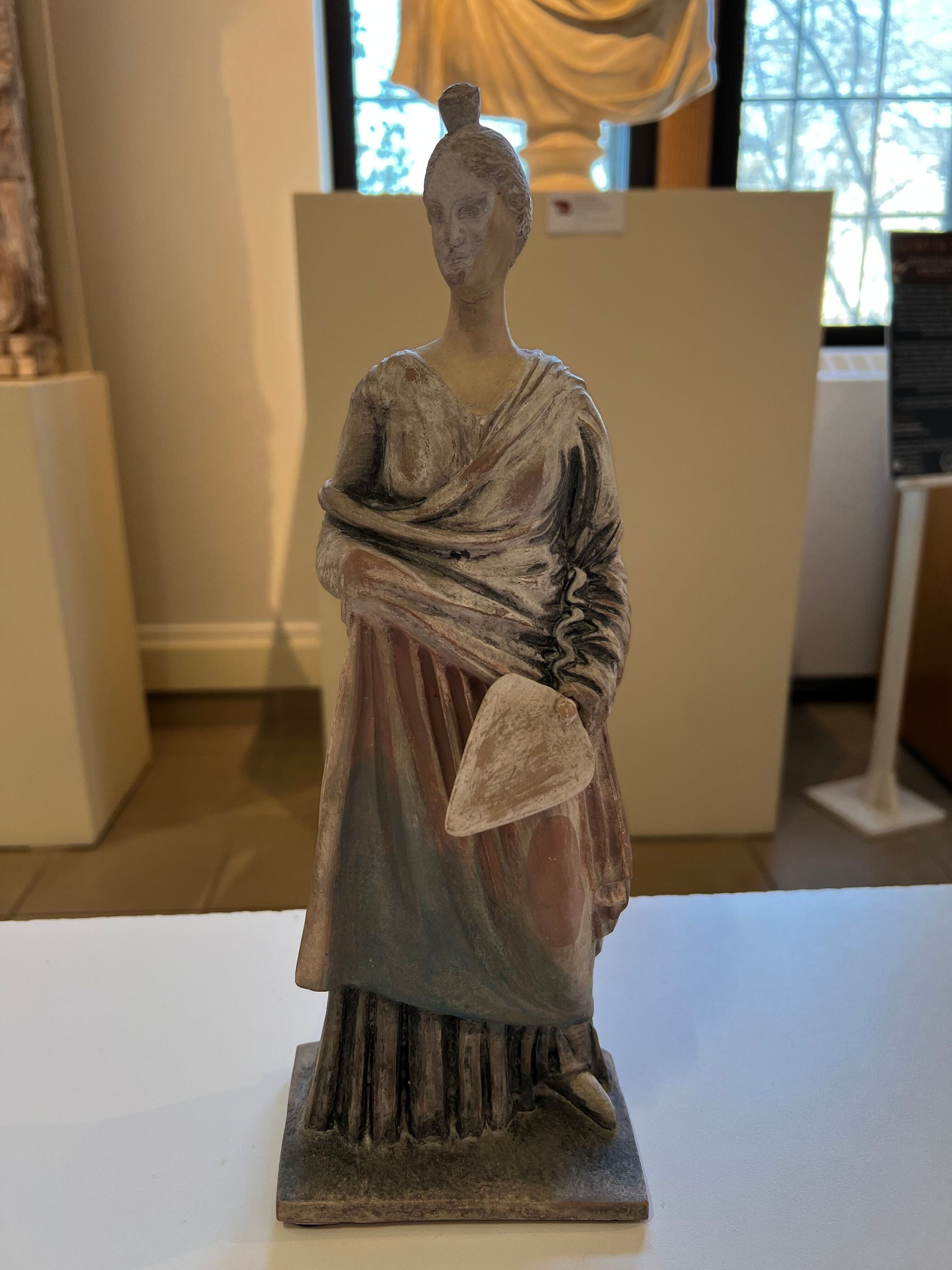 Female figure standing wearing a chiton and himation with a small round hat on top of the head. She is holding a heart-shaped fan in left hand. There are remnants of pink and blue paint on the himation, and dark blue paint on bottom part of the chiton. Remnants of flesh-toned paint of the face, neck and chest. Resin copy of terracotta original.Type of Sculpture