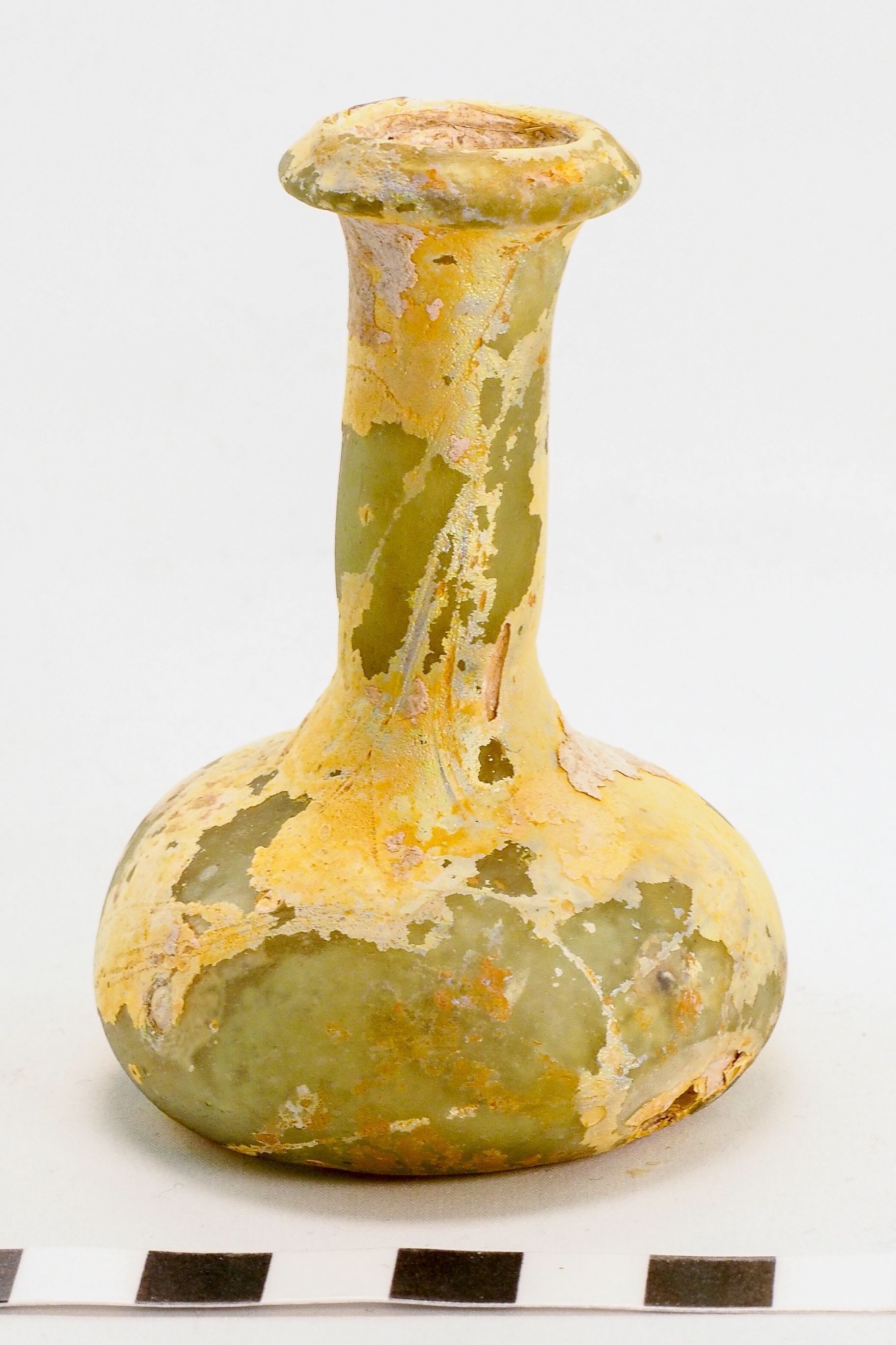The rim is irregular, uneven, and it is everted then folded up and in. The neck is tubular with a slight constriction near the bottom then outwardly splays at the junction with the shoulders. The shoulders are rounded, transitioning into a squat-bulbous body. The base is concave with a pontil mark. The vessel has a 1.5 cm hole to the base, iridescence, and trace encrustation.Context