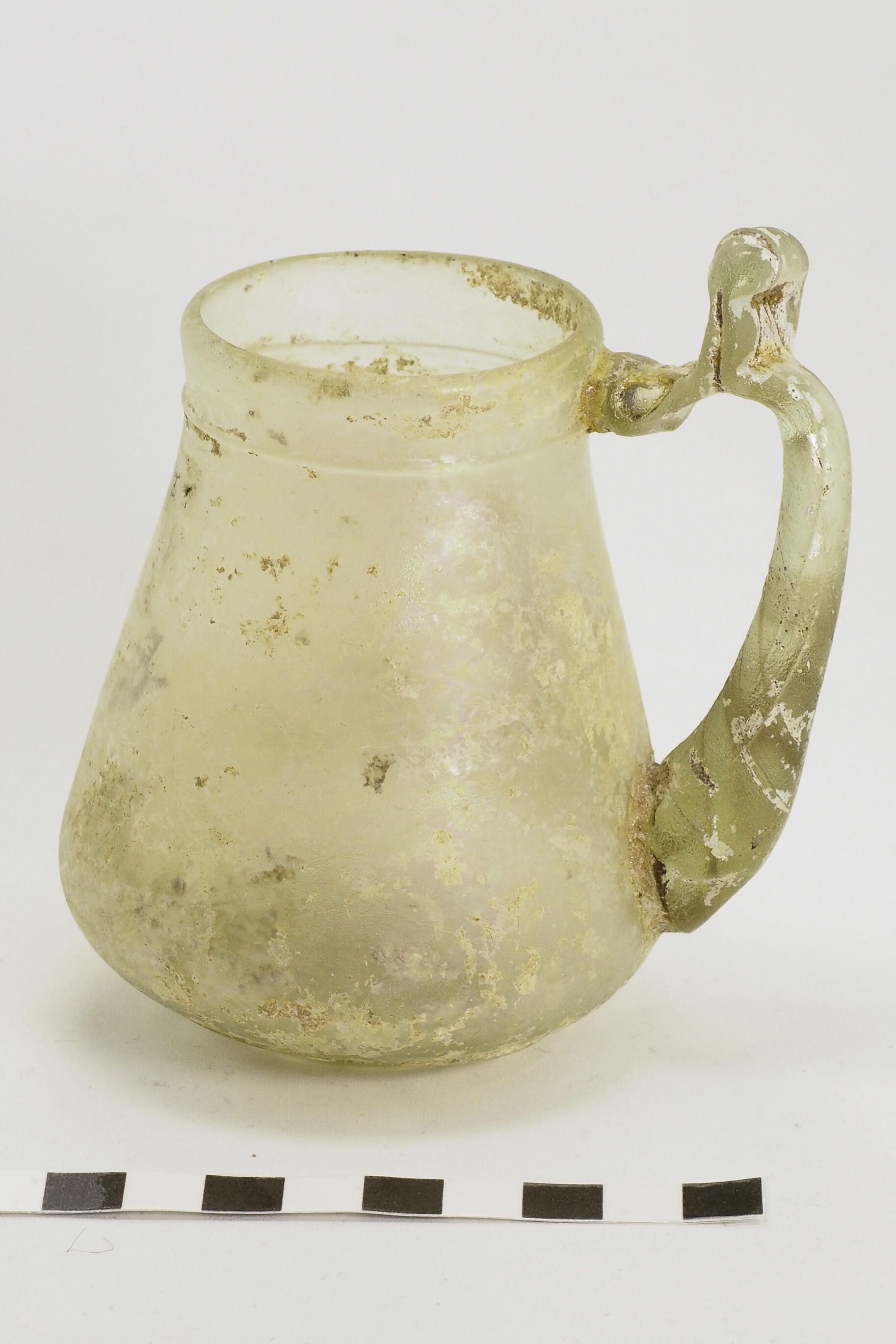 The rim is vertically rounded with vertically descending walls which stop at the attachment of a continuous trailed ring, creating a short neck. From the neck, the walls gently slope outwards creating a bag-shaped body. A gather of glass was dropped near the base of the beaker and drawn up to the height of the rim where the glass was pinched upwards to create a thumb rest and then attached to the rim. The base has two concentric chill marks with a pontil mark at its center. The vessel is intact with some iridescence and the handle seems to have been a later addition to the vessel.Context