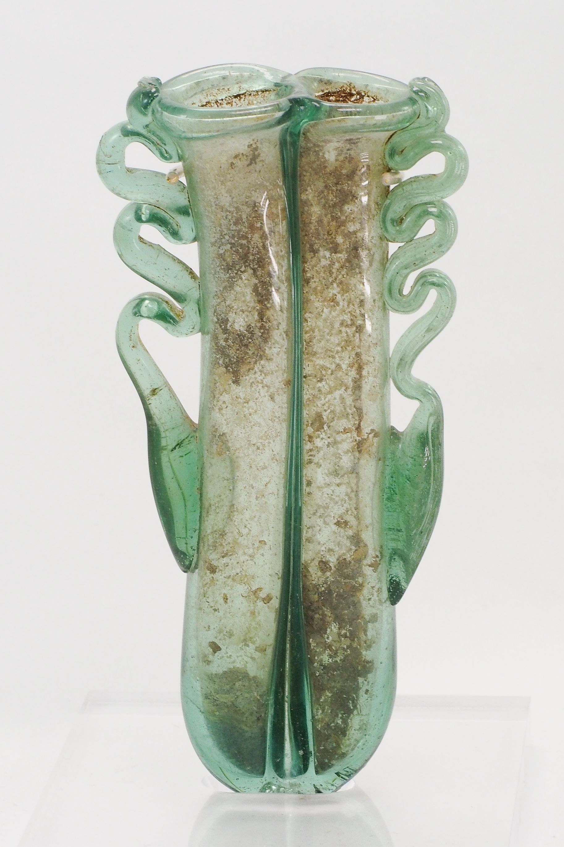 The thick tubular rim is folded outwards. The double tubed vessel was formed by pinching a cylindrical parison to form a vertical diaphragm along the bodies. The walls of the bodies are vertical, curving at the base. Just above the plain base, a thick trail was applied to the body of each tube and drawn vertically attaching twice to the body on one side and three times on the other. The curved attachments create three loops on each handle which are cut off at the lip. The vessel is intact with minor incrustation, dirt, and debris visible inside the bottle.Context