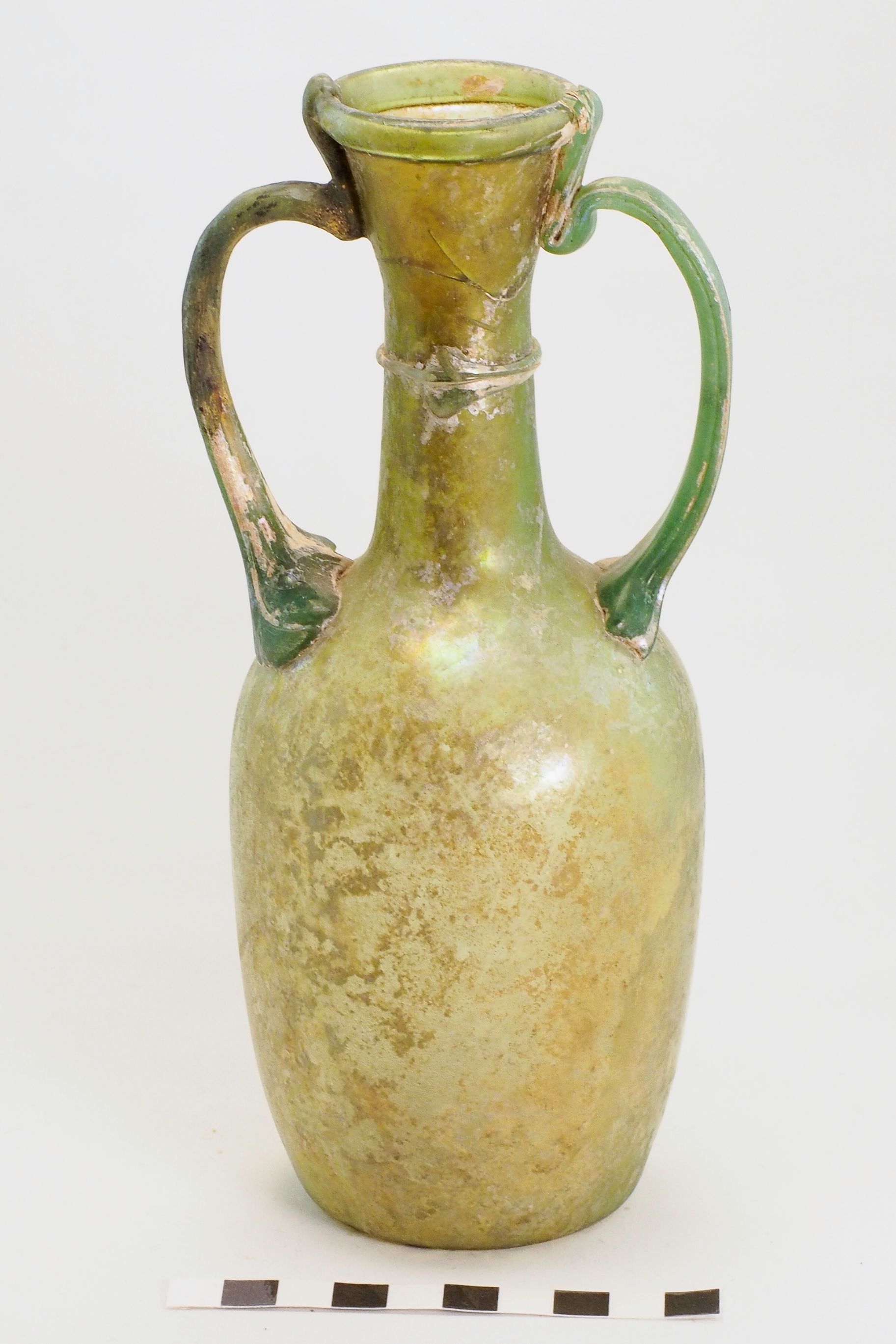 The tubular rim was made by folding it outwards, up, then in. The neck tapers then descends with a single horizontal trail applied to the midpoint of the neck in just over one revolution. The neck then continues, widening slightly at the junction with the shoulders. Two identical handles oppose each other and were dropped onto the top of the shoulders, drawn up, in and down, attaching to the neck midway between the rim and the trailed ring. The handles were then pulled up over the neck, and attached on the outside of the rim. The shoulders slope downwards and the walls of the body bulge slightly before curving towards the base. The base is concave base with a pontil mark. The vessel is intact with a single stable crack to the neck and some iridescence.Context