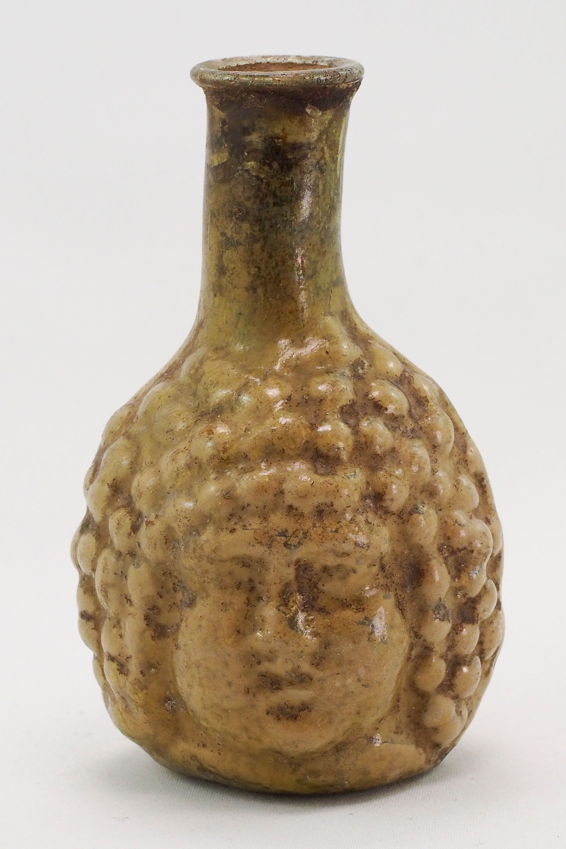 Head flasks often resemble young chubby boys with curly or knobby hair. The faces of children on double headed flasks typically possess the same stylized characteristics: bulging eyes with sunken centers, a prominent nose, cheeks, and lips, with hair in rows of bulbs, the first of which typically resembles a fillet (a hair accessory used to pull the hair out of one's face).