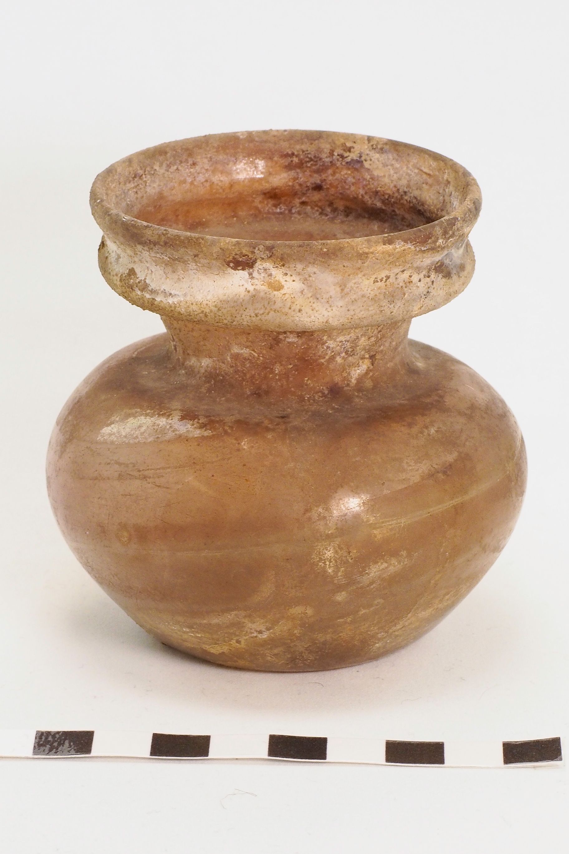The upright rim has a inward protruding tubular-flange which runs horizontally along its midpoint. The neck tapers, splaying at the bottom, creating a depression then merging with the shoulders. The rounded shoulders descend into the squat globular body which tapers to the base. The base is concave with a pontil mark. The vessel is intact with some encrustation and "189" painted in red to the bottom of the body.Context