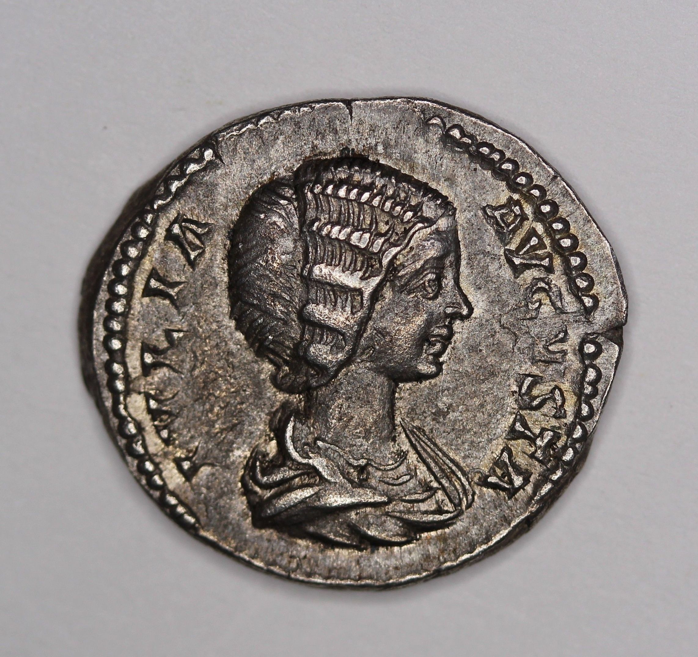 Isis, wearing polos on head, draped, standing right, left knee on prow of ship with right hand baring breasts and holding infant Horus on left arm; rudder resting on altar to left. Border of dots.Transcription