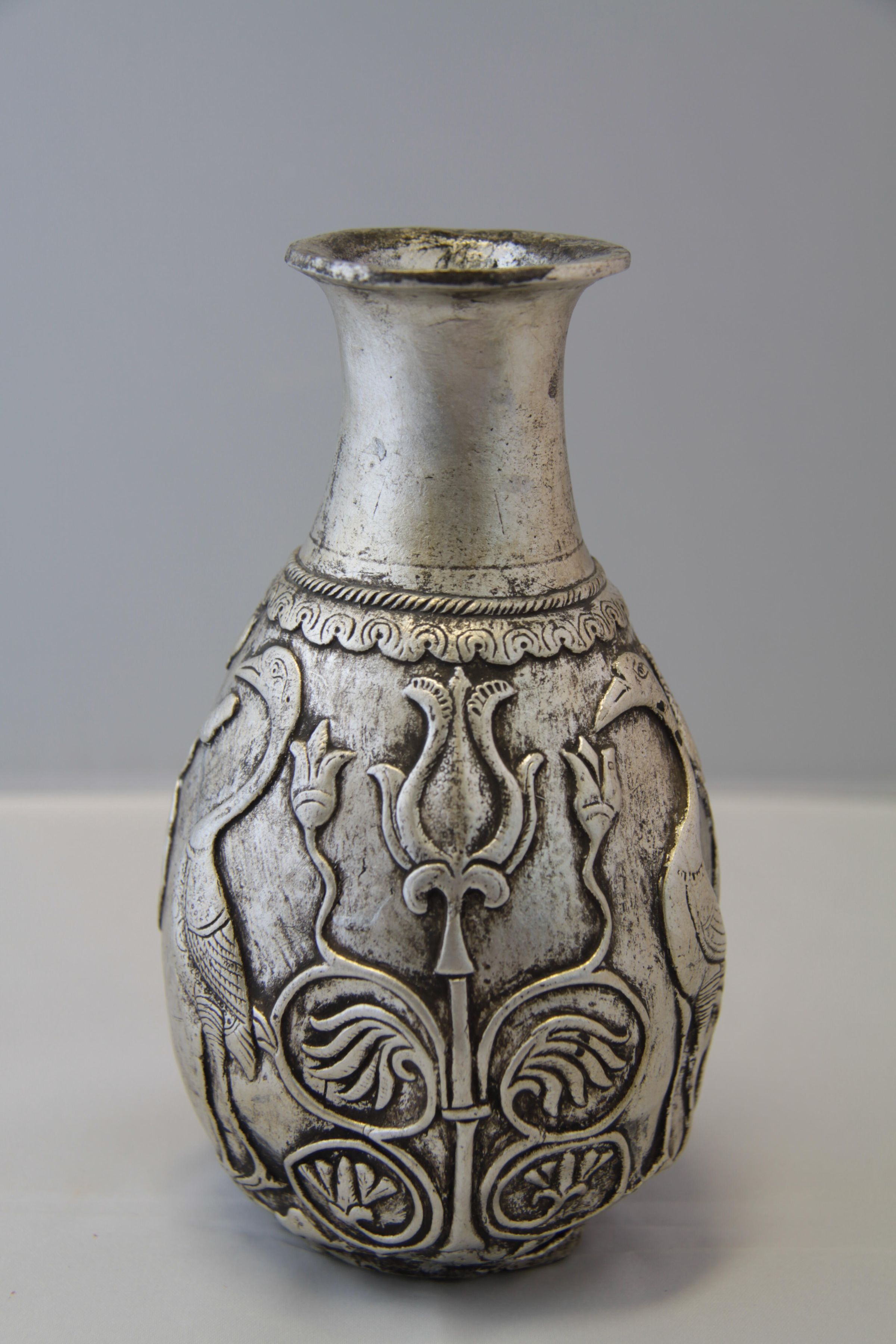 This vessel has a small puncture near the base used to strain haoma, the sacred vine important in Zoroastrian religion. The source of haoma is the Iranian Tree of Life, identifiable by the attached vines. Sprigs of the haoma were brought to earth by divine birds, represented here as large cranes. The left-facing crane seems to be characteristic of early Islamic work, as right-facing images were typical of the Sasanian period.