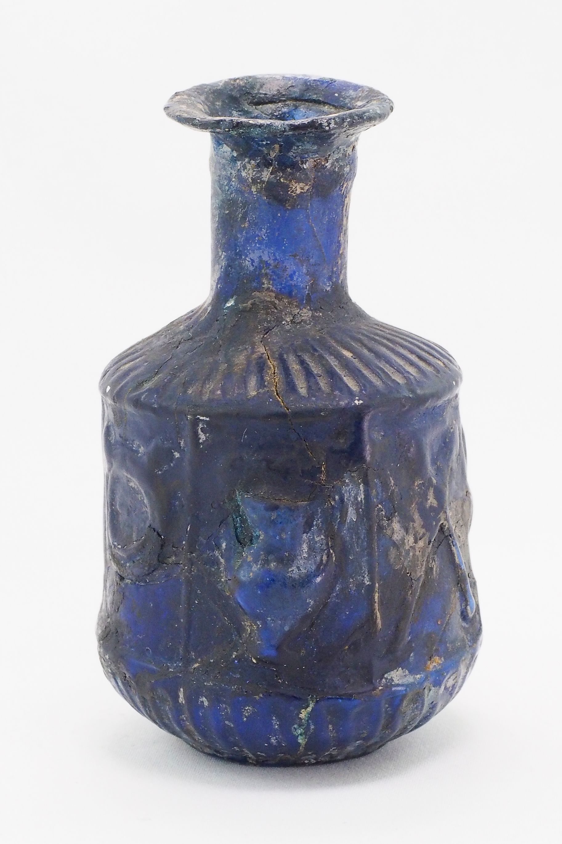 The dark blue colour is a popular style, characteristic of the Augustan period. Although, the finest bottles were made of opaque or glossy white glass to mimic marble. The hexagonal mold-blown vessel is a distinctive early form of glassware which used three molds in its construction. On the vessel, decoration pertained to three zones: the main frieze around the body which consisted of six panels; secondary decoration on the shoulder; and the lower third of the body. These hexagonal vessels appear in five different themes: vessels, masks, fruit, birds, and mixed symbols. The vessel type themes likely imitate an unidentified structure with six niches, whereas the fruit, masks, and mixed symbol types likely imitate hexagonal altars. Although hexagonal altars were not common in classical antiquity, several have been found in the Syro-Palestinian area and Asia Minor. In addition, the hexagonal shape of the body likely imitates religious architectural structures.