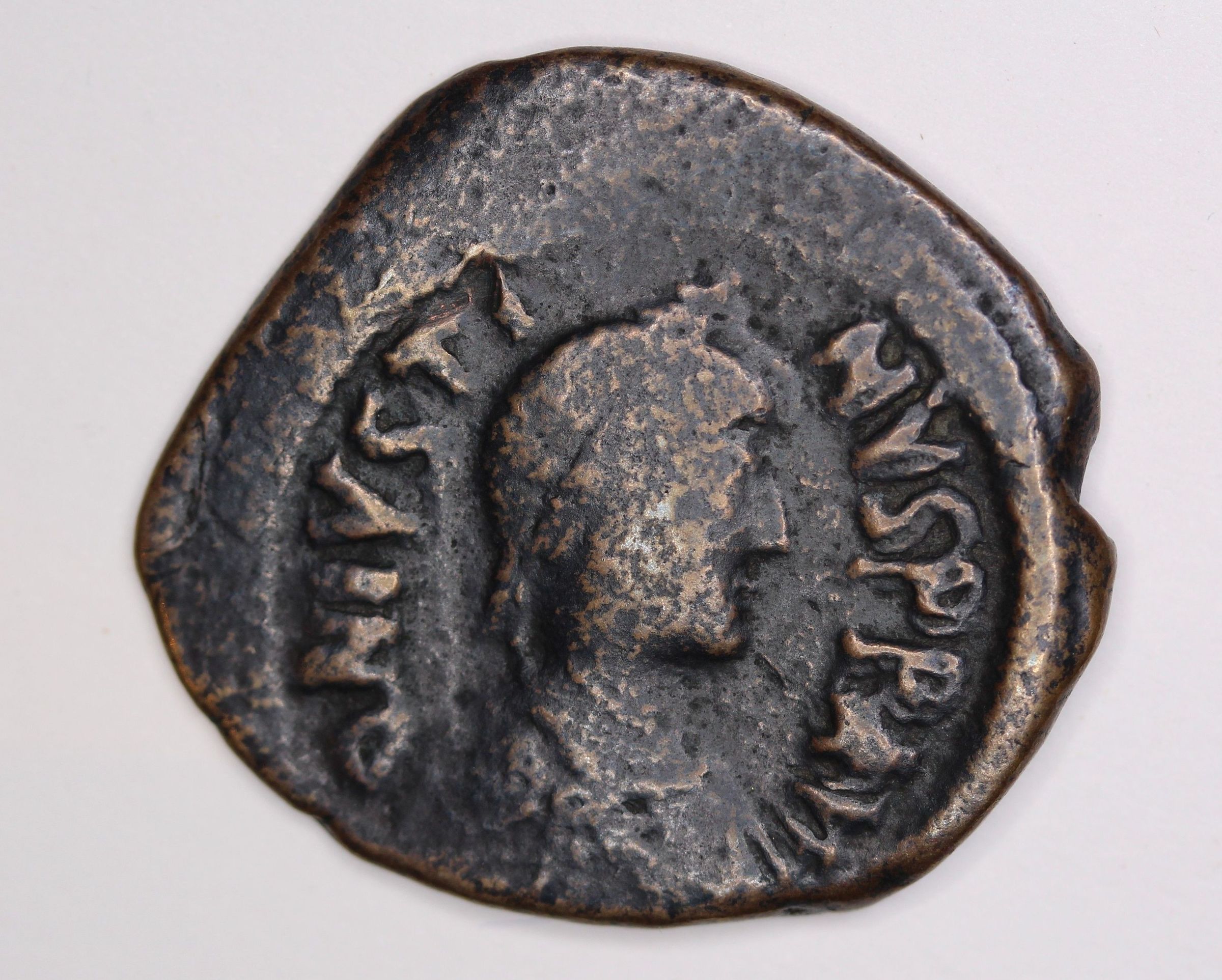 A bronze follis (denoted by the letter 'M') of Emperor Justin I with a small Latin cross and stars in the reverse design.