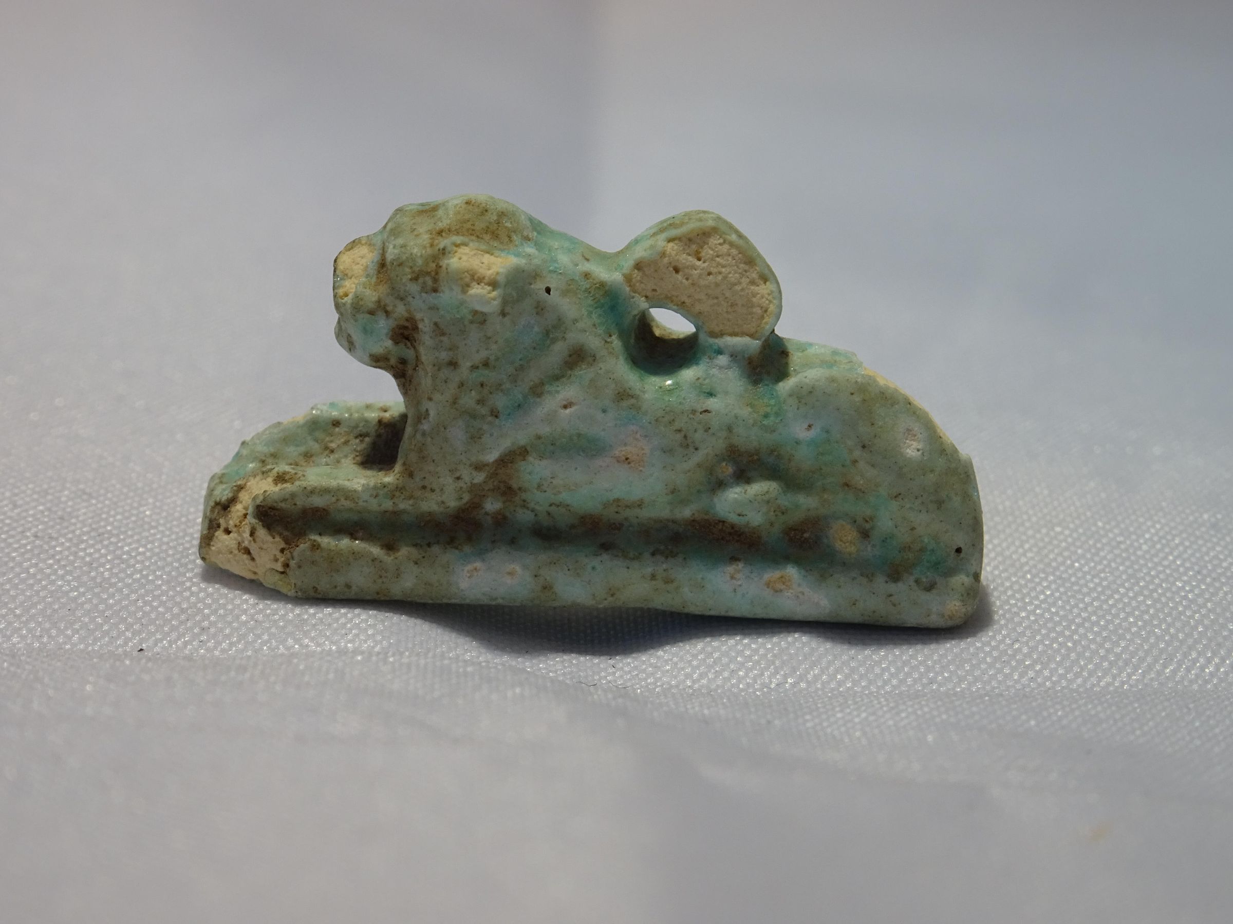 The Egyptians believed that misfortune and disease originated from malign spirits and the hostile dead. Maintaining health and prosperity was therefore achieved by providing protection against these forces. Amulets representing particular forces were worn around the neck for good luck and protection. They were also buried with the dead to ensure safe passage to the afterlife. The lion was a solar animal, and to begin with the lion image was only equated with the sun god. As a solar animal it could symbolize both destruction and death at night and rebirth in the morning. Through this solar symbolism the lion was connected with Nefertem, and was frequently depicted with two heads, in order to able to follow the course of the sun. In addition to this the lion is a symbol of power, able to instill terror in all.Dimensions