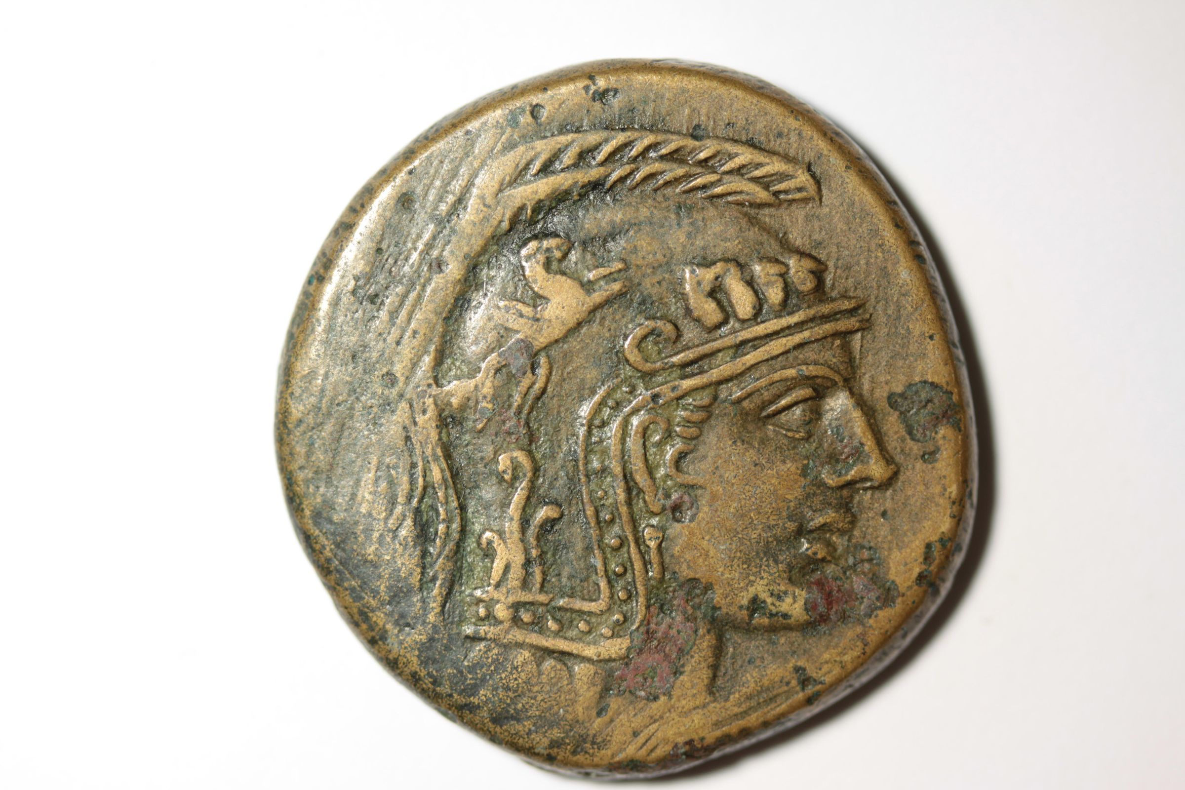 Perseus standing, facing, holding Medusa's head in left hand and harpa in right; to left in field, ME monogram; below, Medusa's winged body.