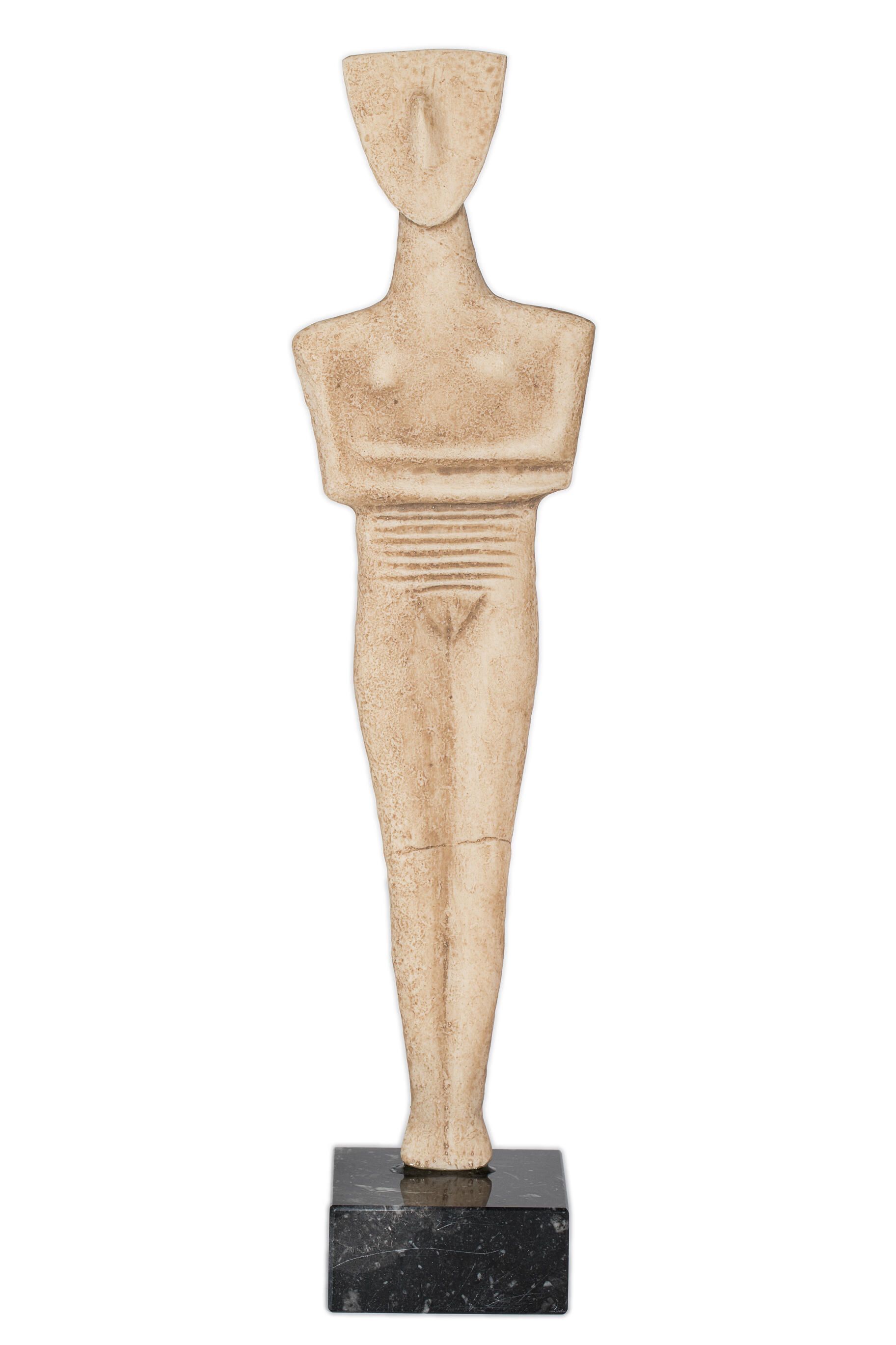 Female figure with head facing forward. The face is expressionless and smooth, with the exception of a protruding nose. The arms are crossed beneath small, slightly protruding breasts. There are several incised lines below the crossed arms. The legs are closed together. An incised pubic triangle can be viewed.Made/Created