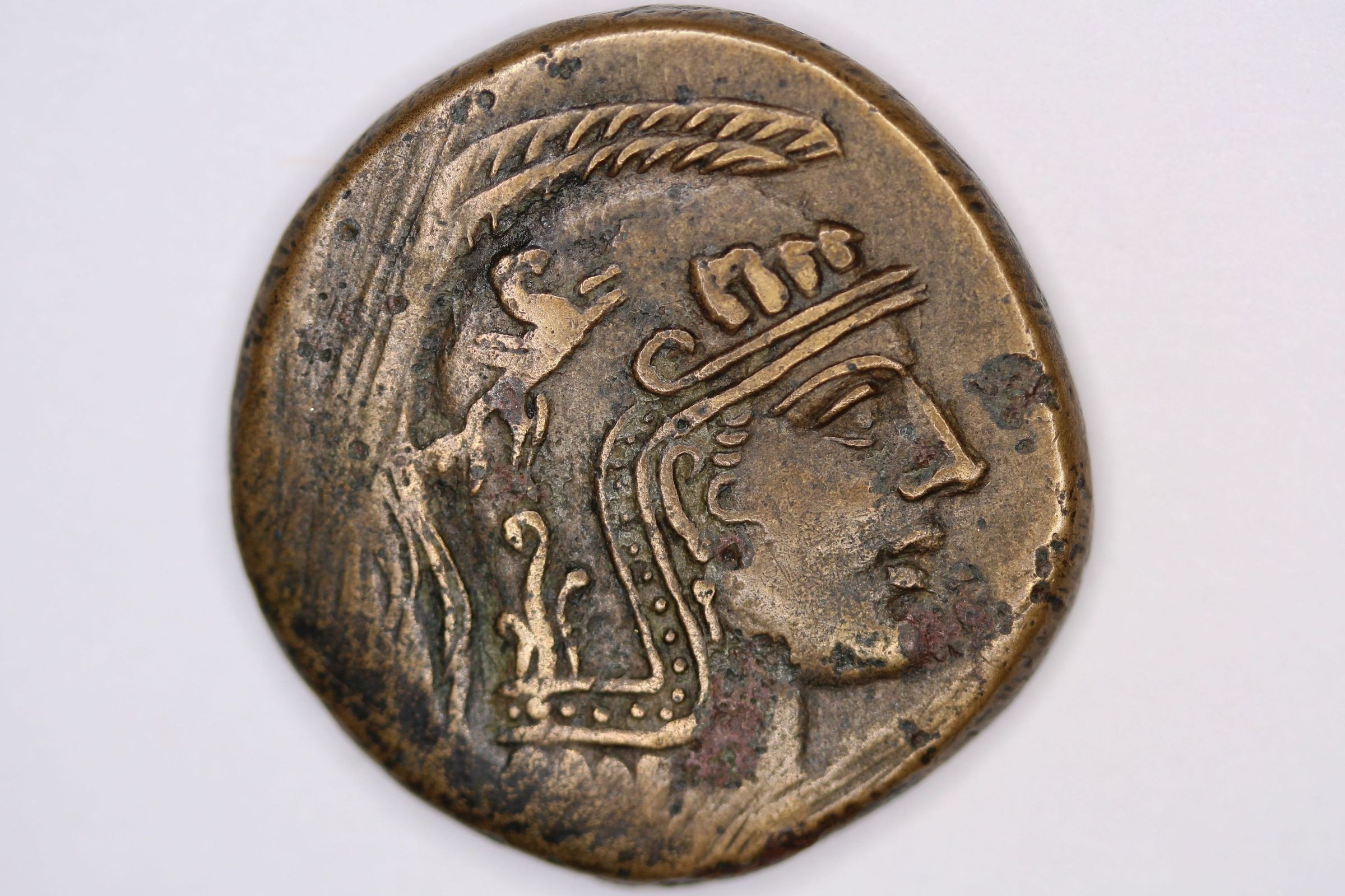 Perseus standing, facing, holding Medusa's head in left hand and harpa in right; to left in field, ME monogram; below, Medusa's winged body.