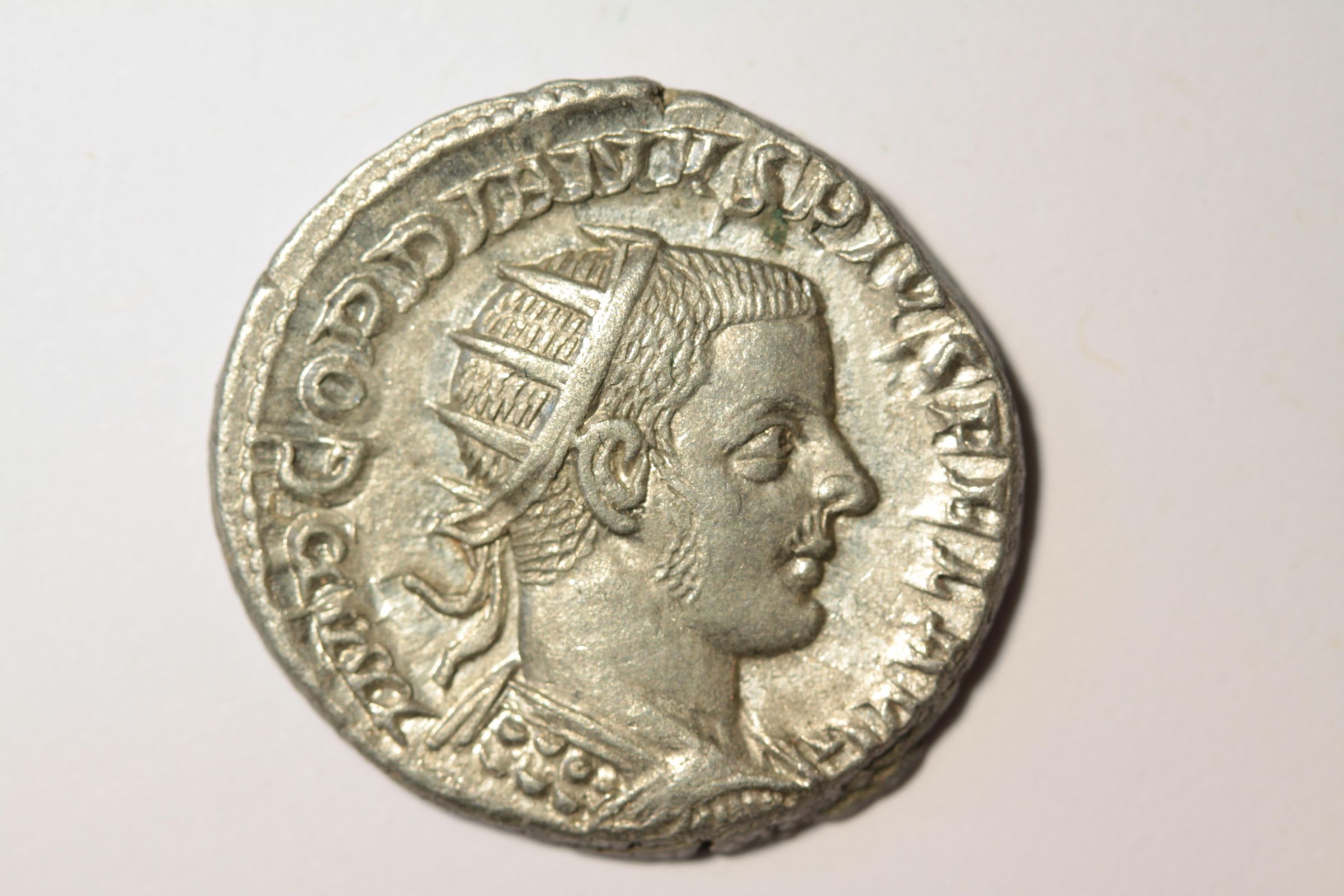 Bust of Gordian III radiate, draped and cuirassed, right. Border of dots.