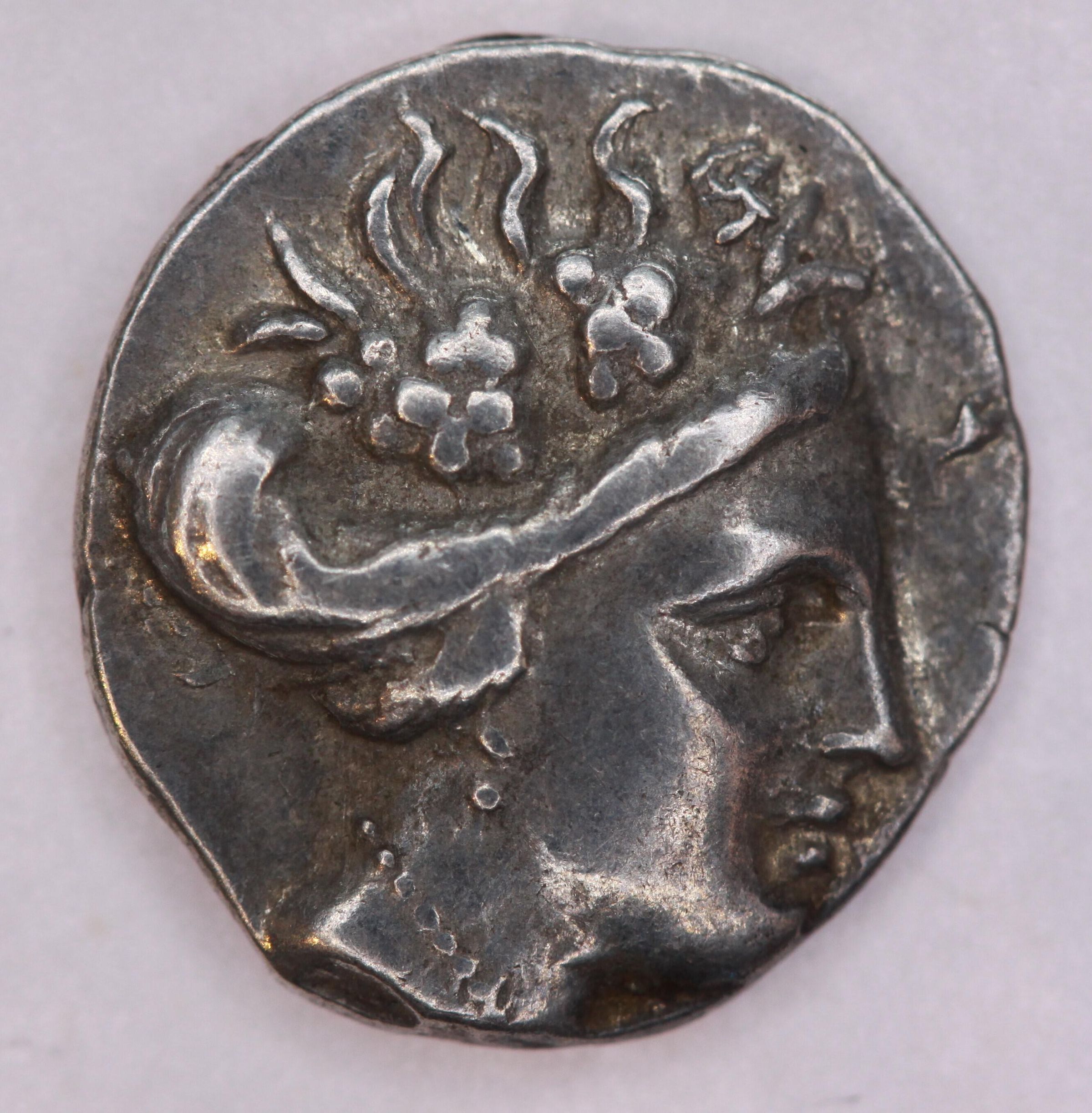 Head of the nymph Histiaia, vine-wreathed and hair rolled, wearing necklace, facing right.