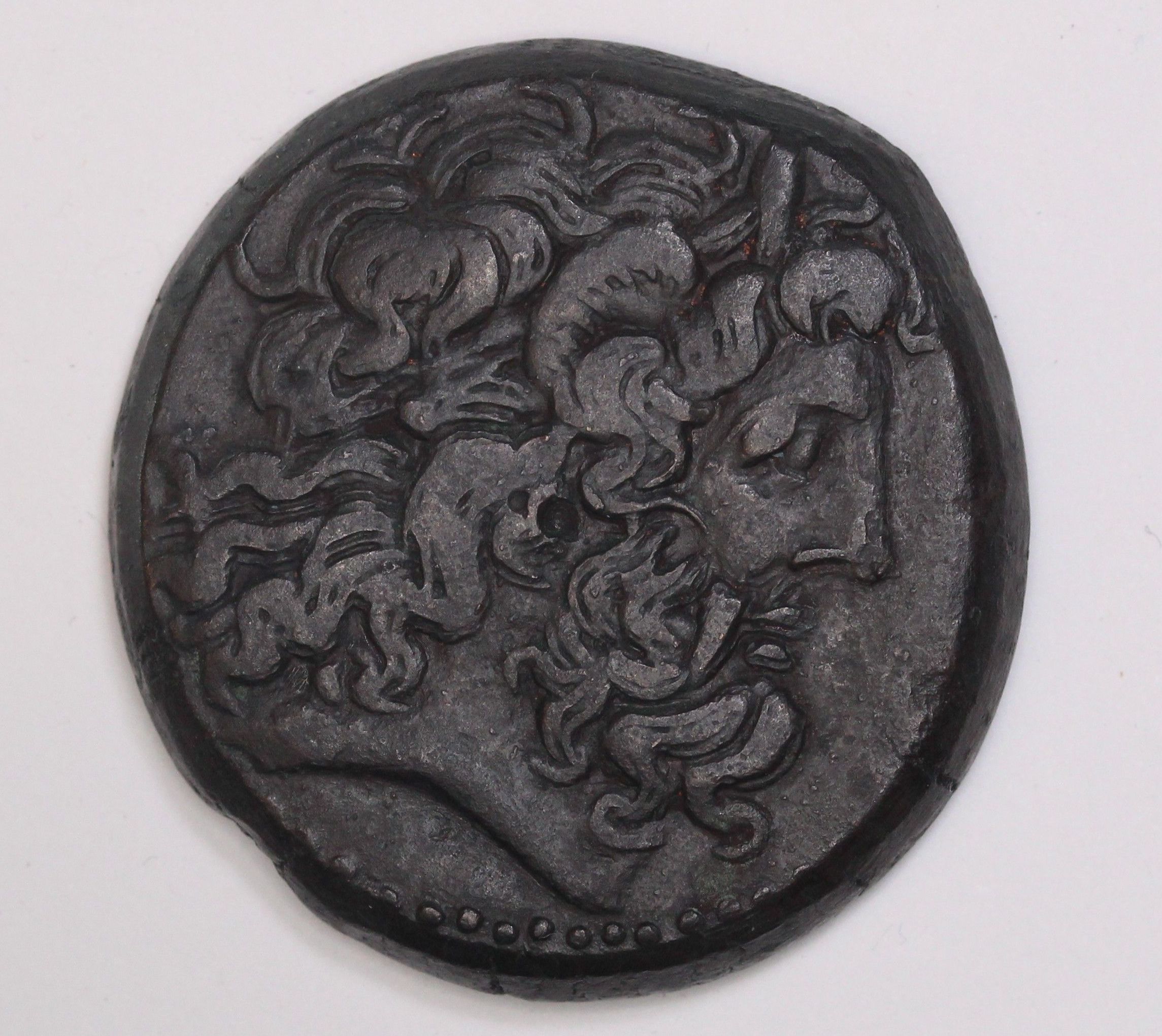 Eagle standing on thunderbolt, left; to left in field, club of Herakles; ΔI between legs.