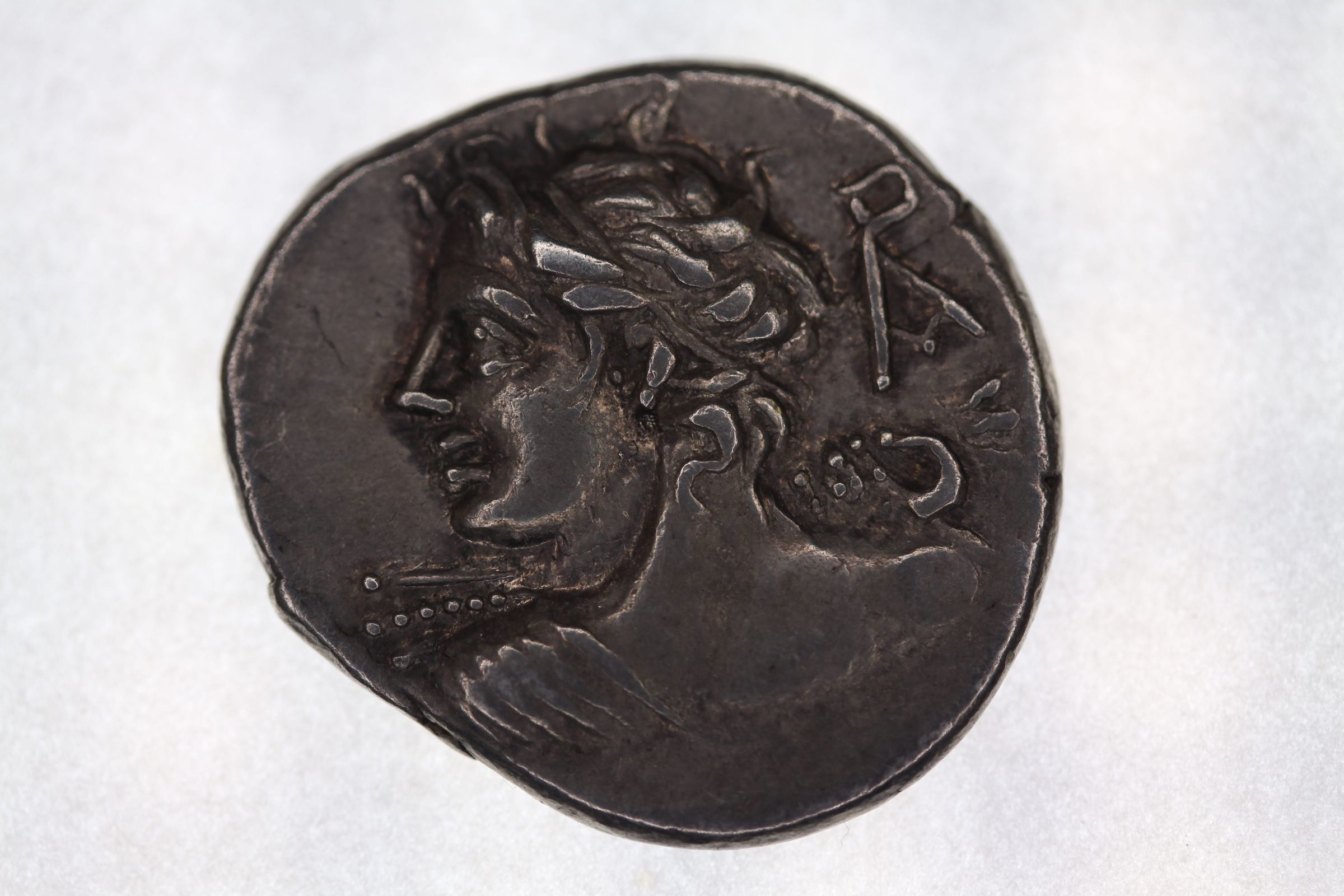 Bust of Apollo, seen from behind, head turned left, holding a thunderbolt in his right hand. Border of dots.