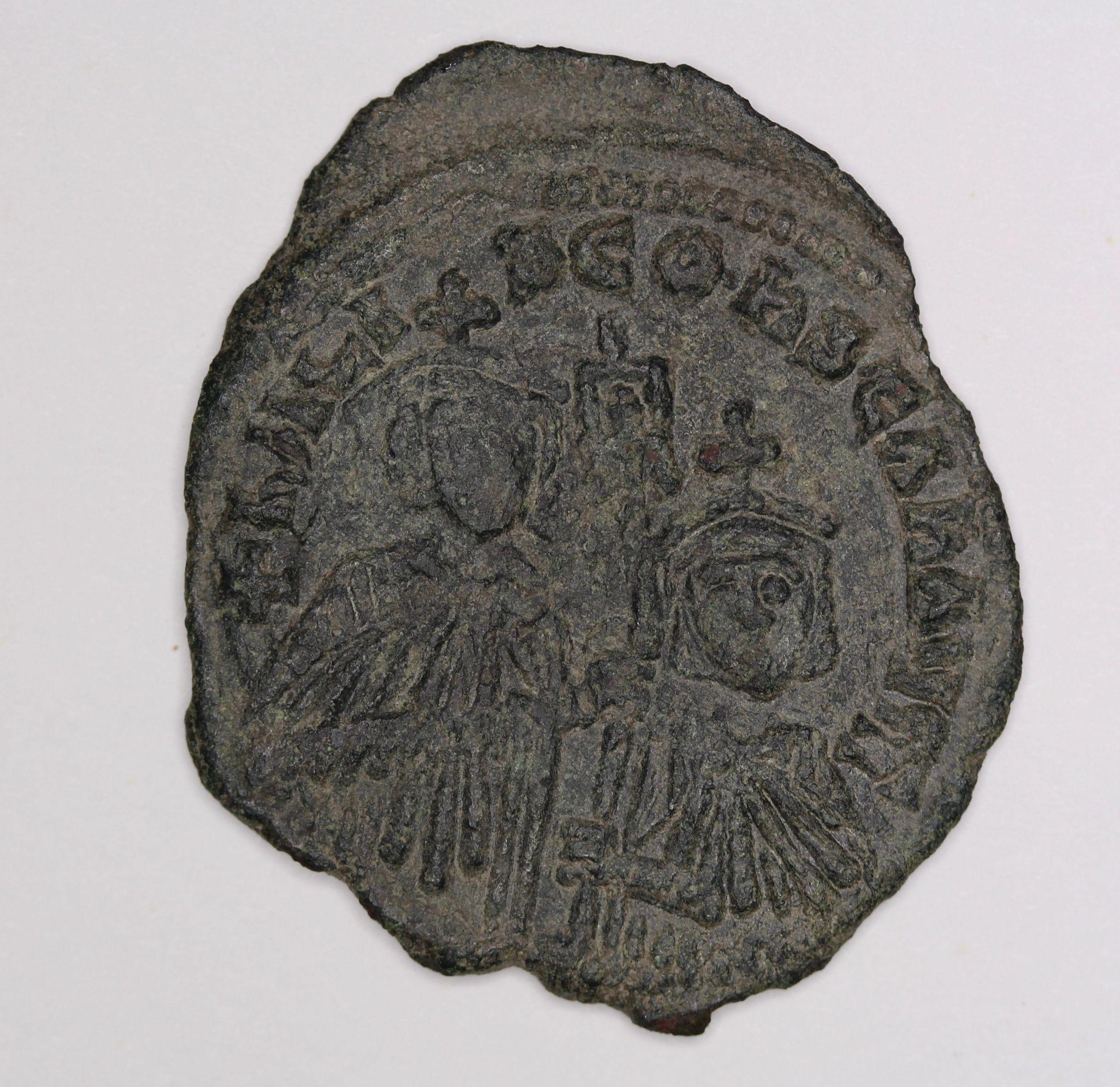 Basil I, crowned, laureate, seated facing; to right, Constantine, crowned, laureate, seated facing; both holding a standard bearing X between.