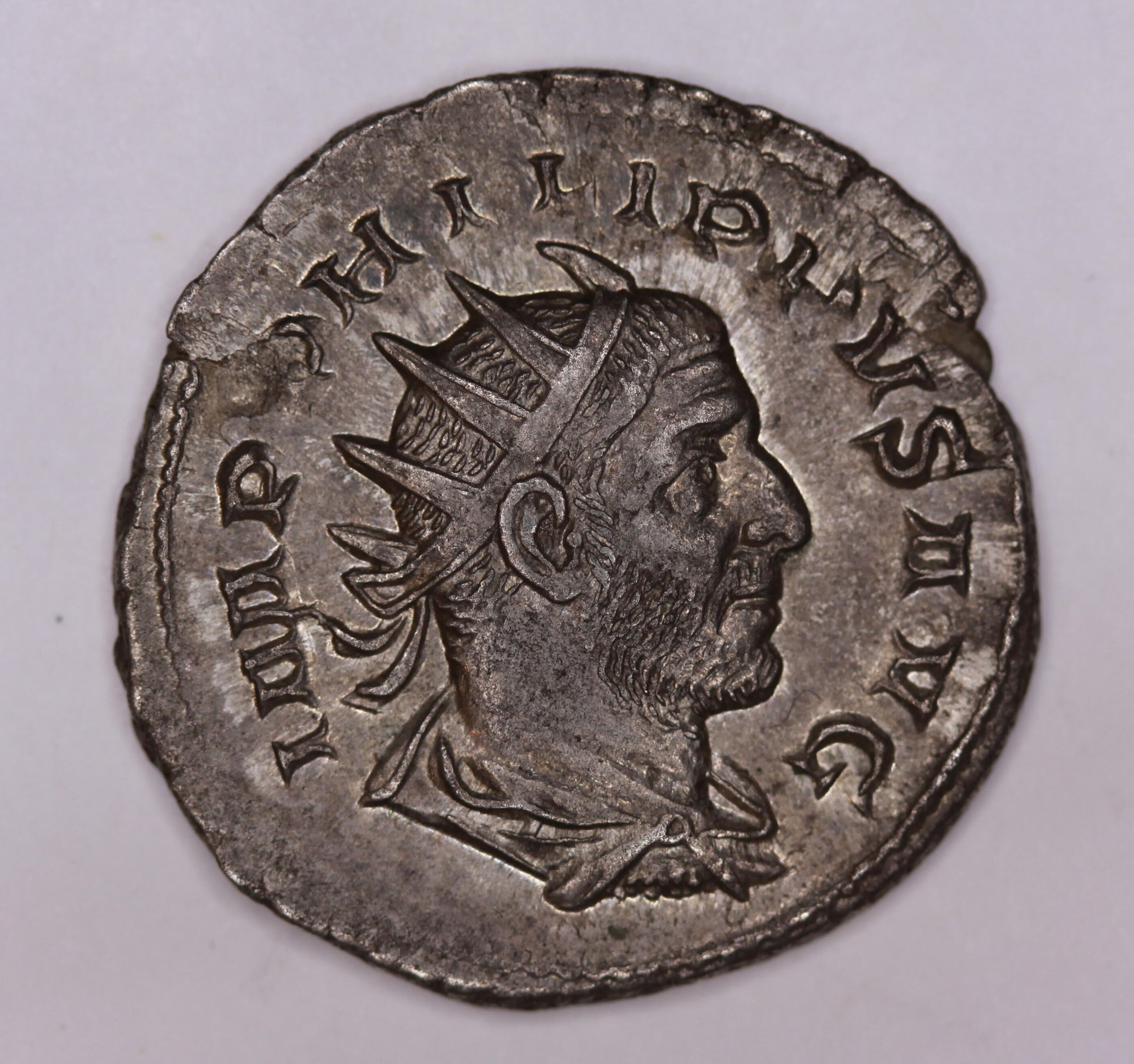 Bust of Philip I radiate, draped and cuirassed, right. Border of dots.