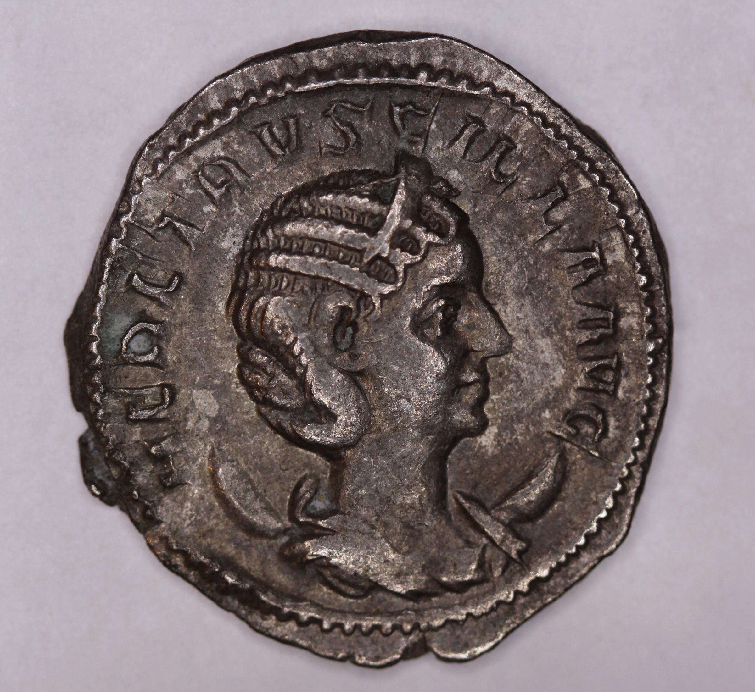 Bust of Herennia Etruscilla diademed, draped, right, on crescent. Border of dots.