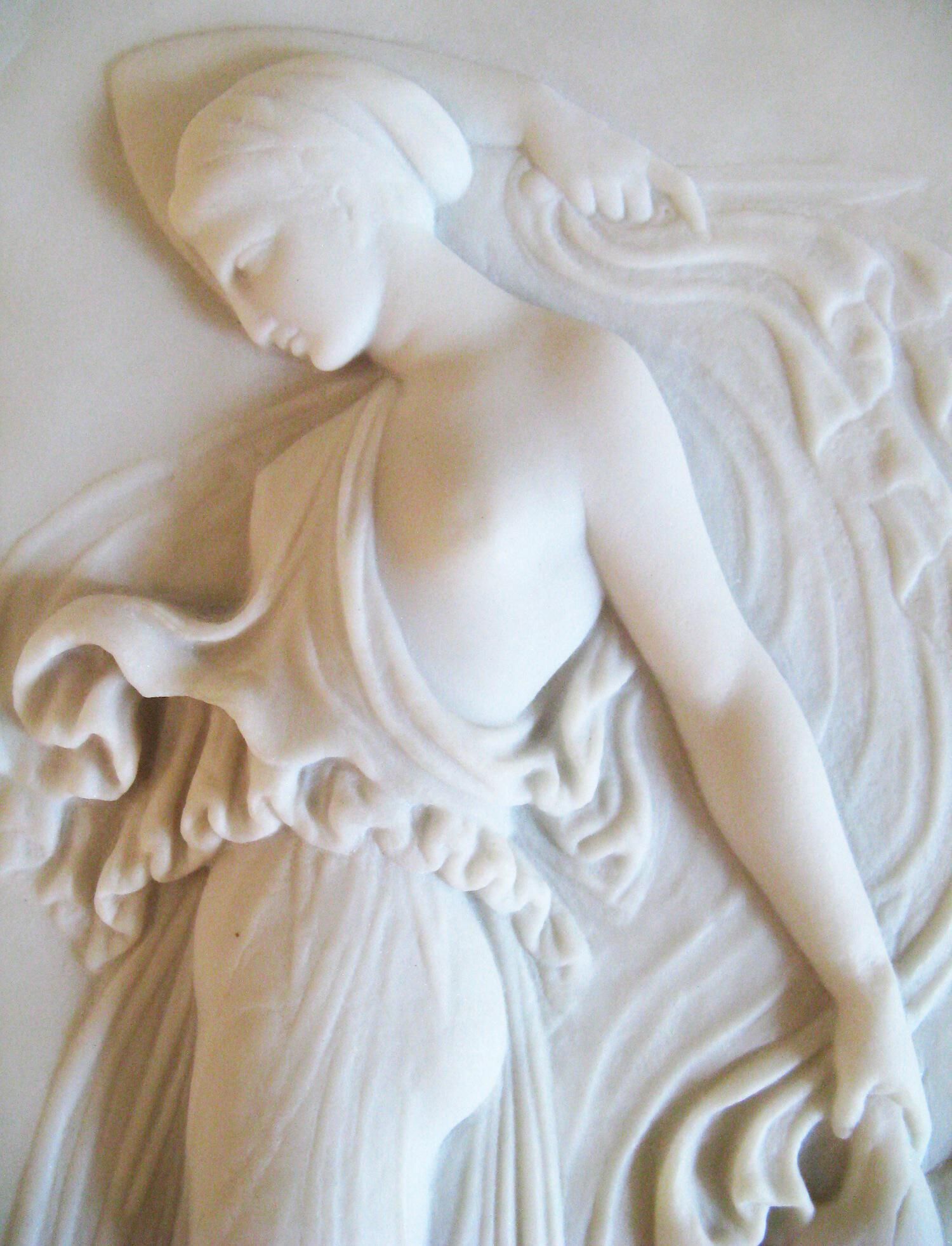 Relief depicting a frenzied maenad, draped, grasping a knife over her head in her right hand, swinging severed hind quarters of a roe in the left. She has a delicate, slim body, apparent under the thin veil which leaves one breast and arm bare.Type of Sculpture