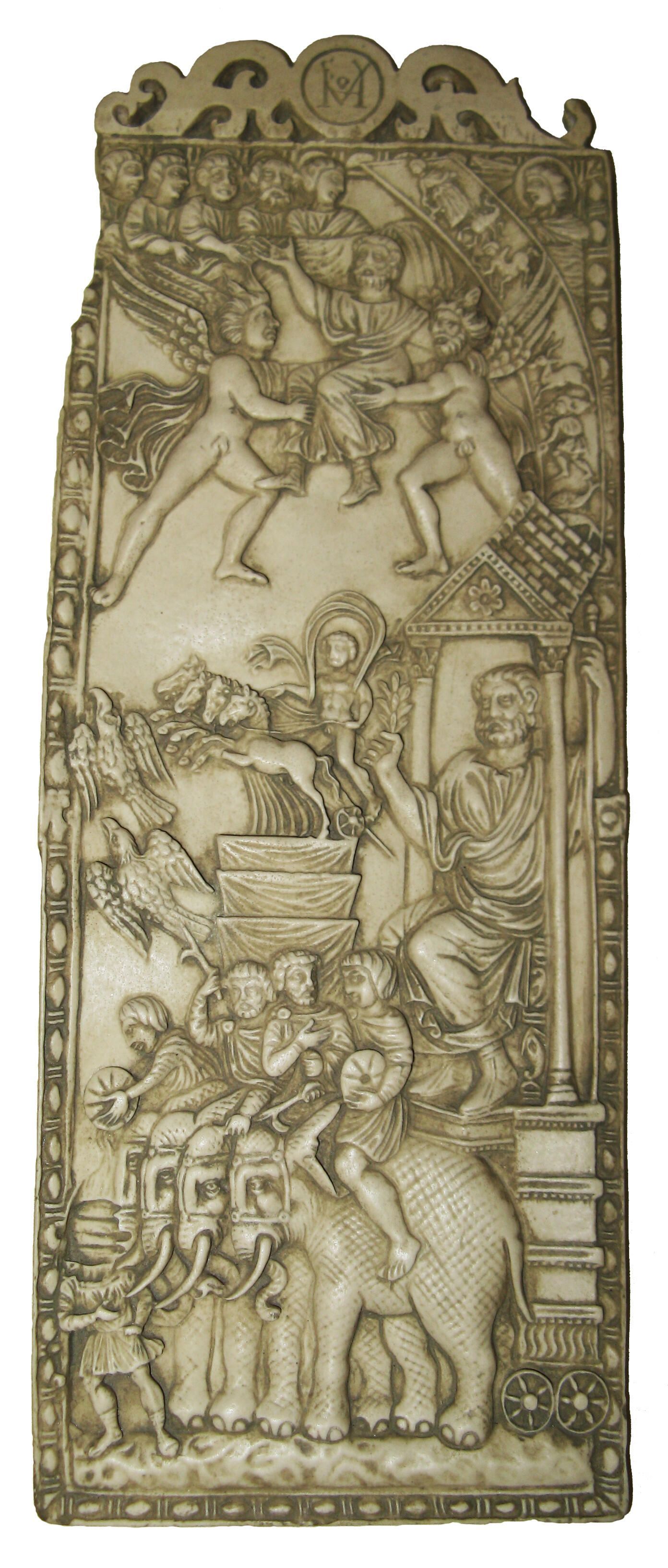 This carved ivory panel is one half of a diptych, a hinged book cover more usually made of wood. It shows an orator, a Roman statesman, being raised to heaven in a scene reminiscent of depictions of apotheosis (elevation to godhood) aimed at conveying the divinity of an emperor or member of the imperial family. It is not surprising, therefore, that the central figure of this scene was believed to be an emperor, but more recently scholars have proposed that this figure is Roman senator and pagan apologist Quintus Aurelius Symmachus (c. 340-402 CE), who held the prestigious offices of Governor of Africa Proconsularis and Urban Prefect of Rome during his political career. Symmachus is best known for his letters and dispatches, which survive in fragments, and for his opposition to the removal of the Altar of Victory from the Roman Curia or Senate House, by the emperor Gratian (r. 359-383 CE).