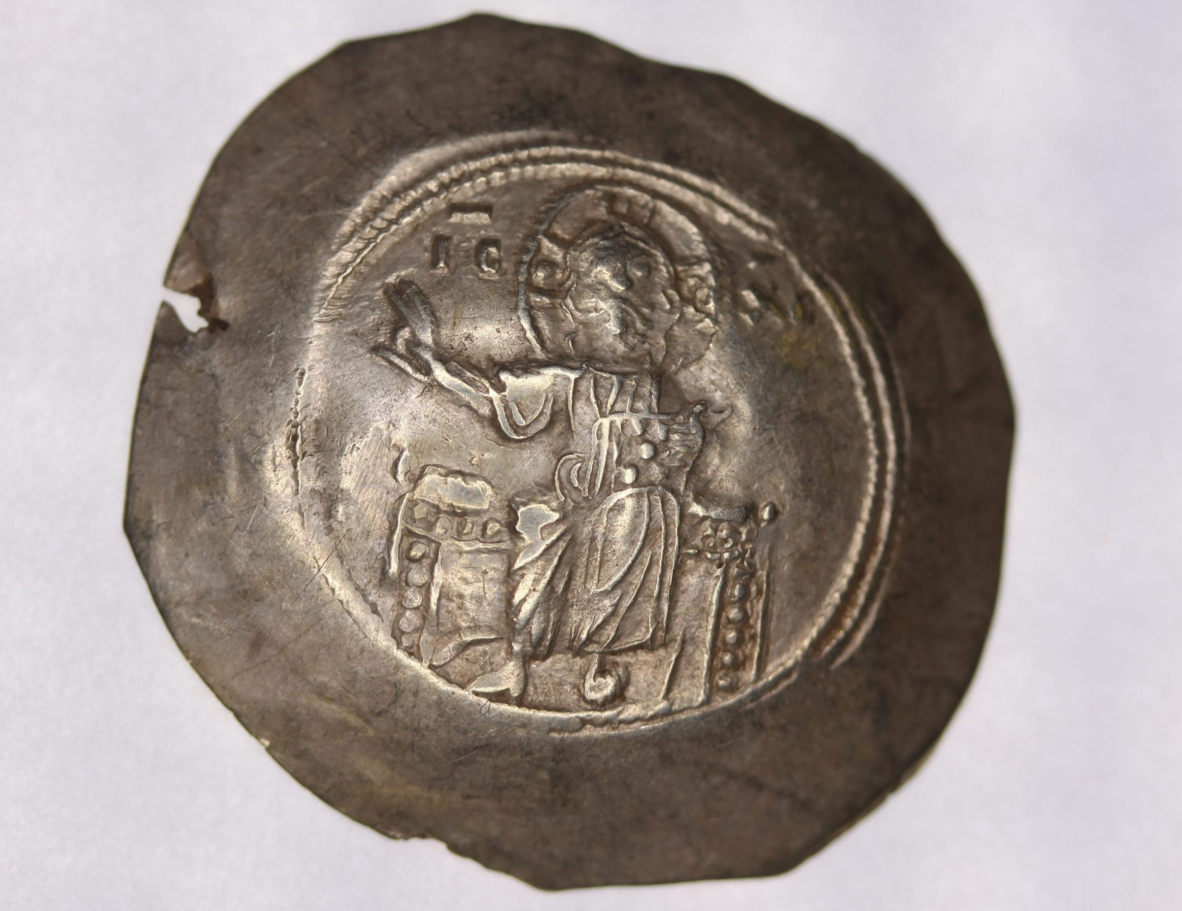Christ nimbate, facing forward seated on throne without back, wearing pallium and colobium, right hand raised in benediction, holding book of Gospels in left hand, on left and right of nimbate IC and XC (with lines above).