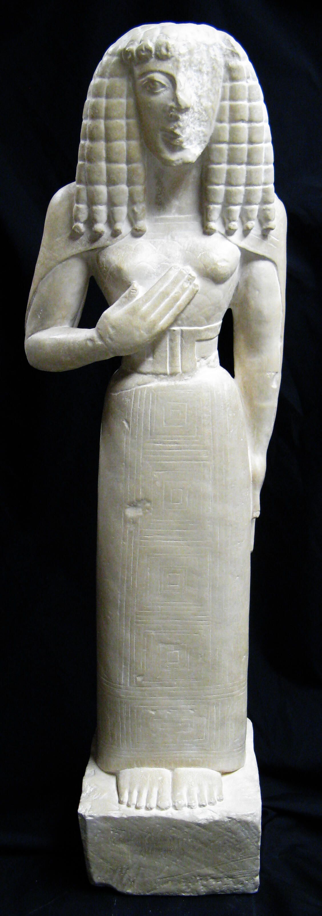 Small figure of a woman with stylized hair and dress. Hands and feet are unnaturally elongated with right hand on chest just below the breasts. She wears a dress of ancient Cretan type with shoulder covering, scallop decoration on the bodice, a broad belt at waist, as well as geometric meander and key decoration running vertically down the front of her dress. Her hair is possibly a wig rendered in an Egyptian style. She is standing on a plinth/base. Left side of the face is heavily damaged, with further damage on the left shoulder and along the back.Type of Sculpture
