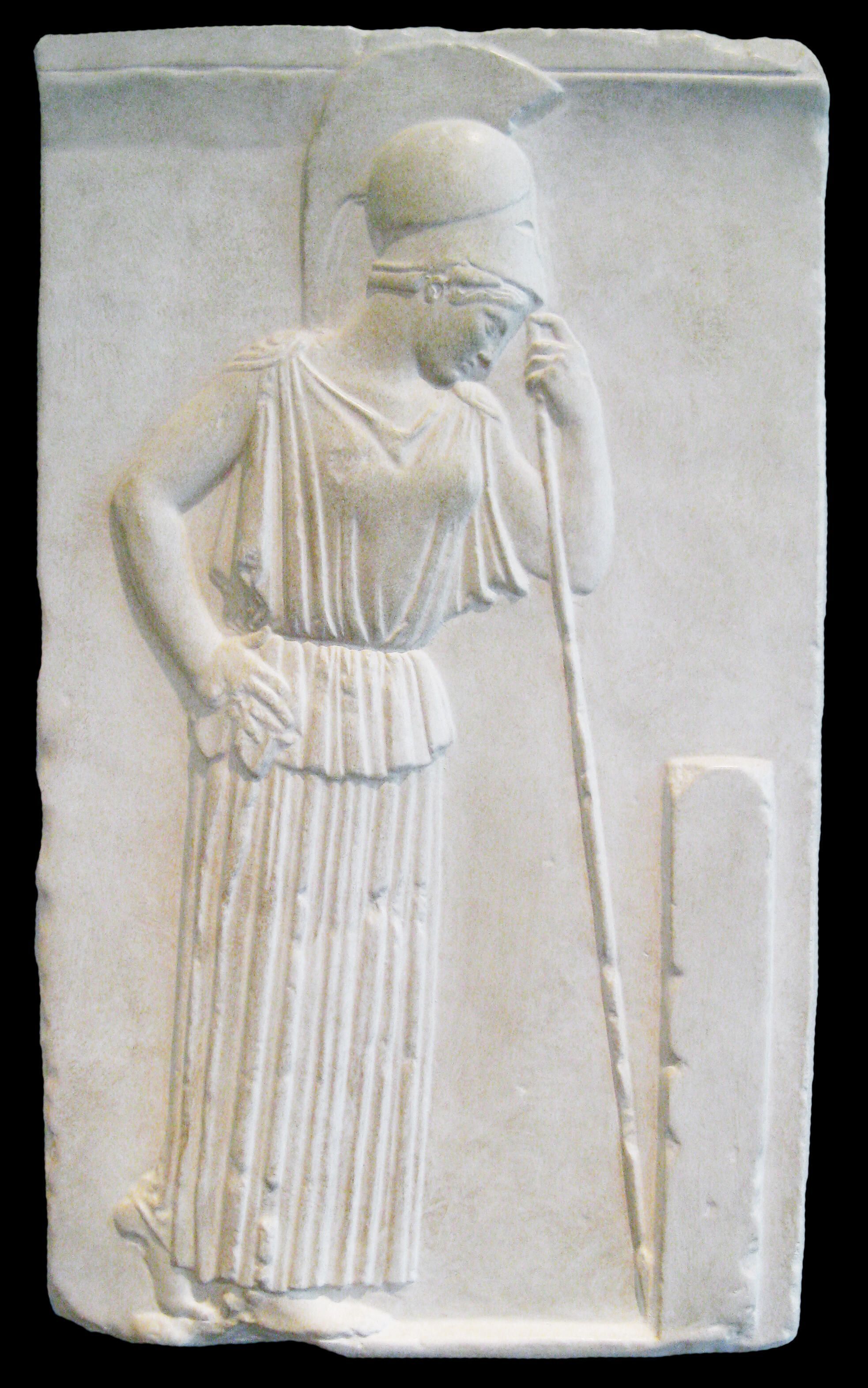 Bas-relief of Athena wearing a peplos and a Corinthian helmet, holding a spear in her left hand, her right hand placed on her hip. She stands, leaning on the spear looking down towards a stele on the left side of the relief.Type of Sculpture