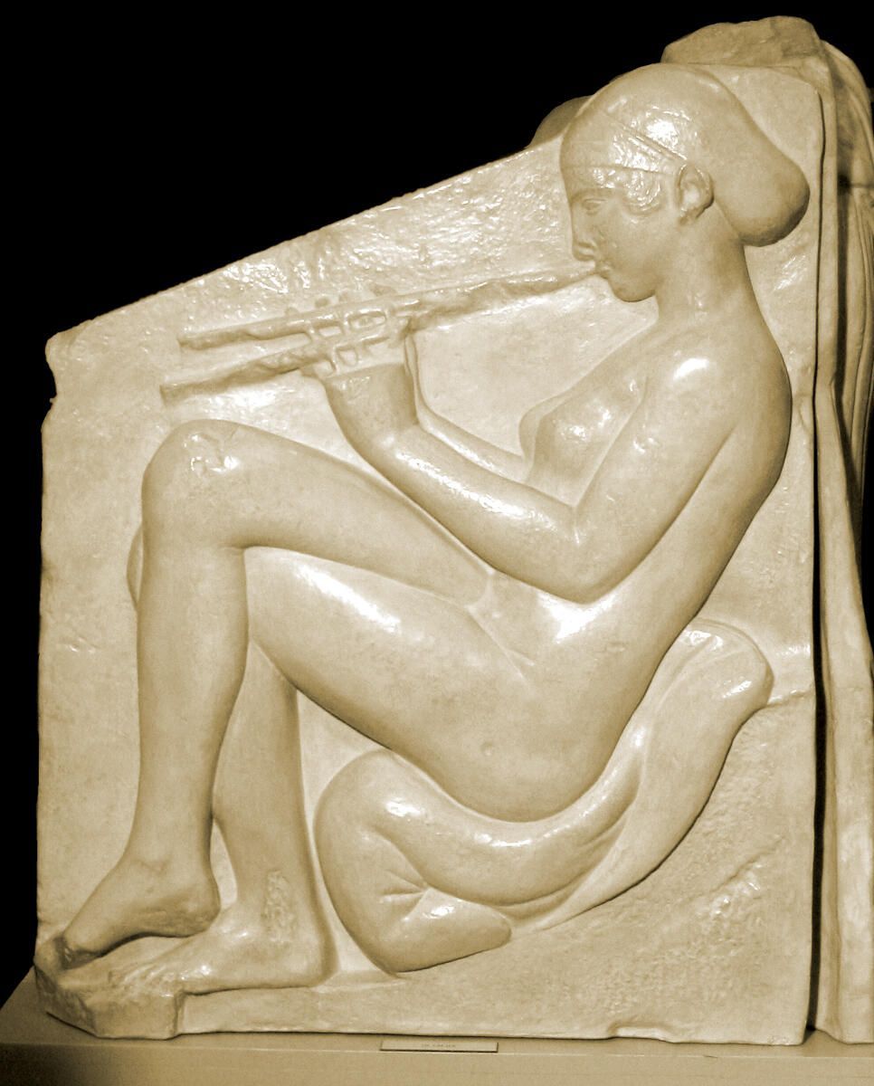 A relief of a nude woman who is seated and playing the flute. One leg is crossed over the other. She was a hetaera, or courtesan and they were affiliated with worship at temples of Aphrodite.Type of Sculpture