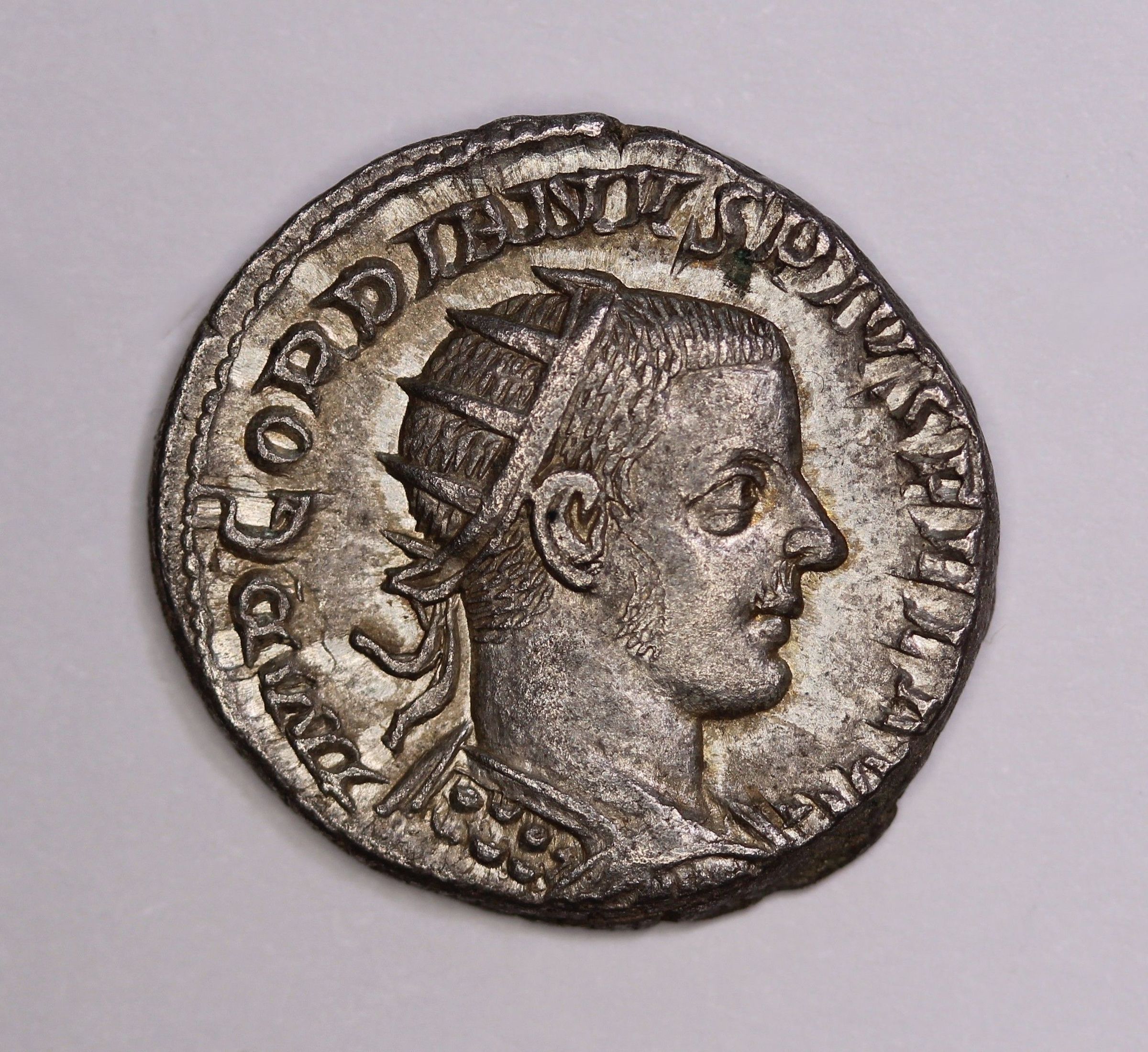 Bust of Gordian III radiate, draped and cuirassed, right. Border of dots.