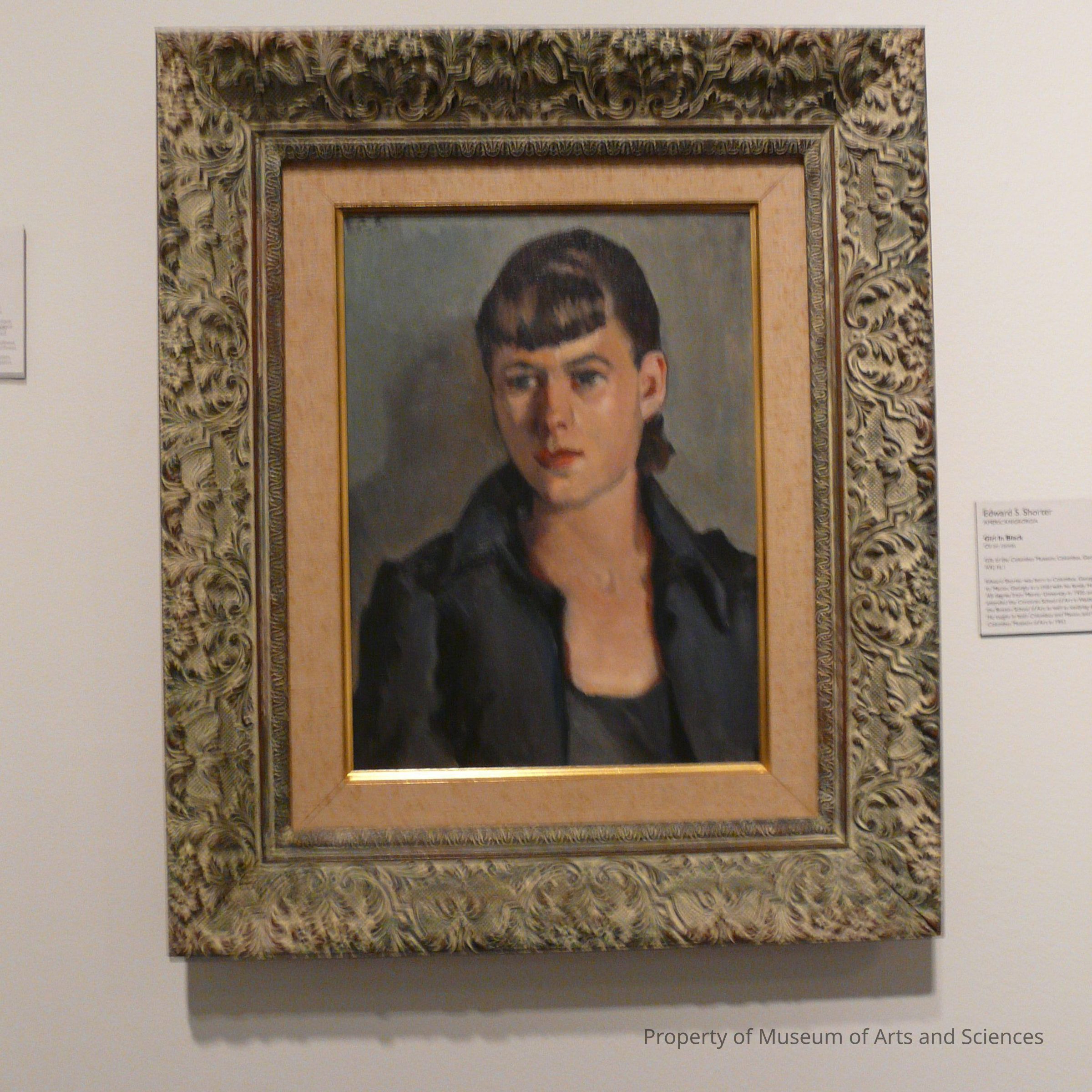 Figure study of a young woman wearing a black dress and jacket. She looks slightly to the left; her hair is dark with banks and the sides tucked behind her ears. The jacked is coloraed and open at the front revealing a scooped neckline on the dress.Collection