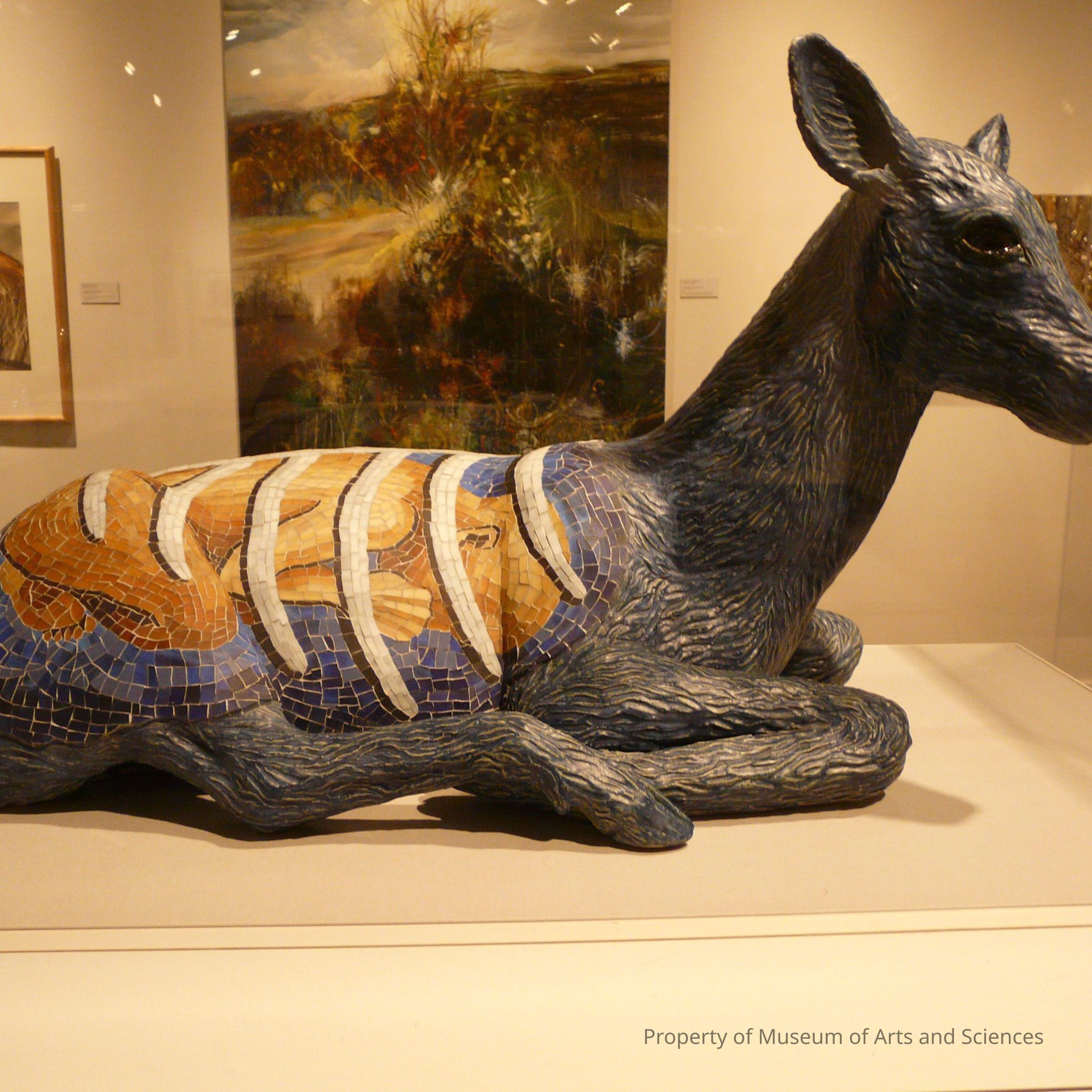 The sculpture presents amosaic deer in blue tones with an interior figure of a child in a fetal position seen through the deer's ribs. The deer is seated with its feet and legs curved beneath it. Its head is turned slightly to the right and holds the viewCollection
