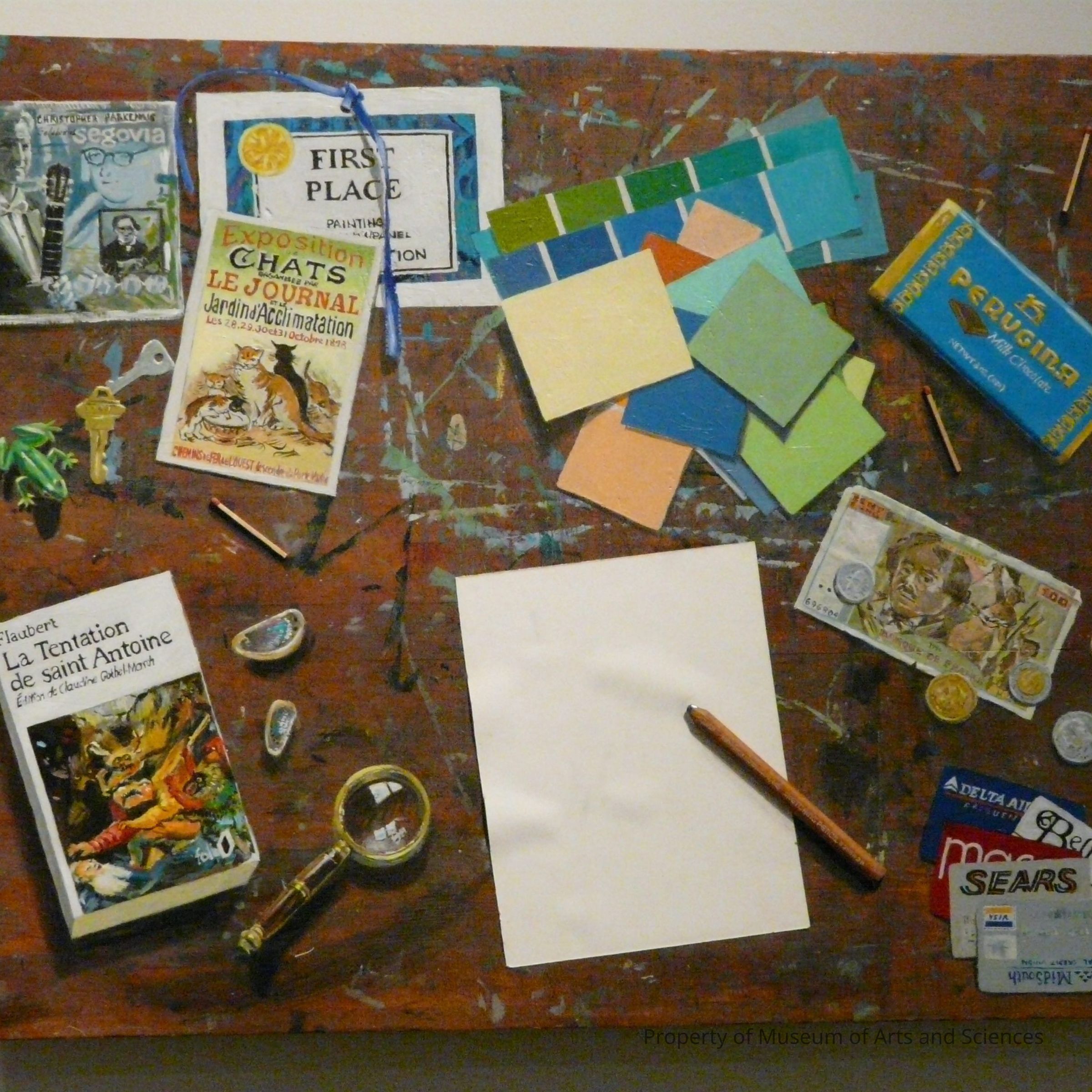 trompe l'oeil painting of the artist's worktop with cd cover, two books, award certificate, magnifying glass, chocolate bar wrapper, keys, credit cards. Painted on an aged wood drawing board with applied materialsArtwork Details