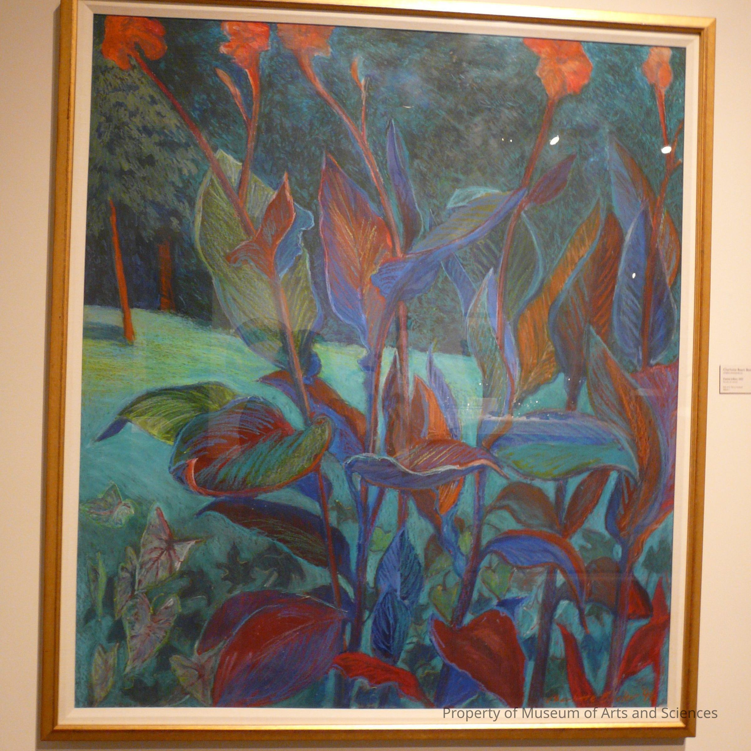 Blooming canna lilies in a garden executed in blues and greens accented by orange blooms.Collection