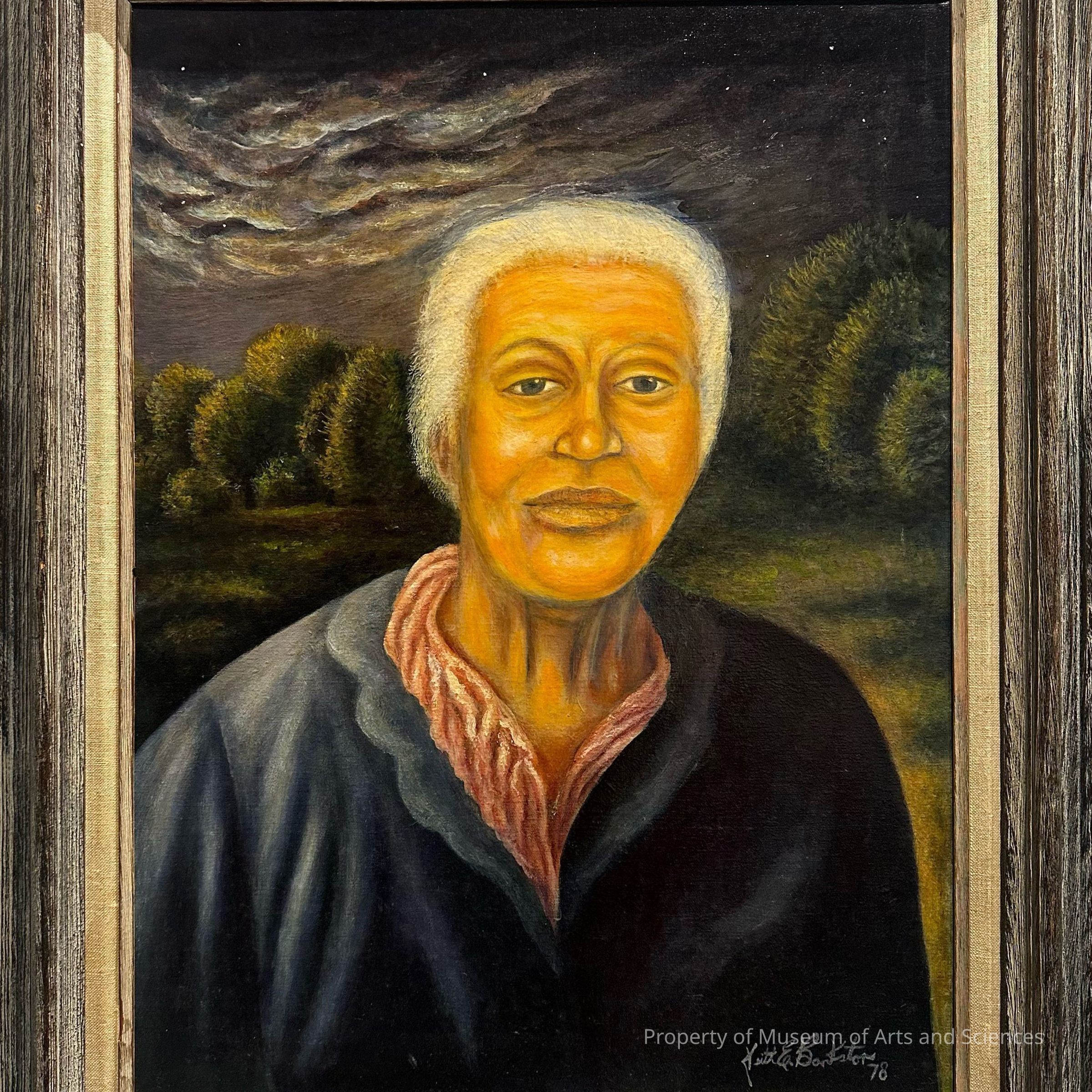 This portrait shows an elderly woman seemingly at peace in a lush but dramatic rural landscape.