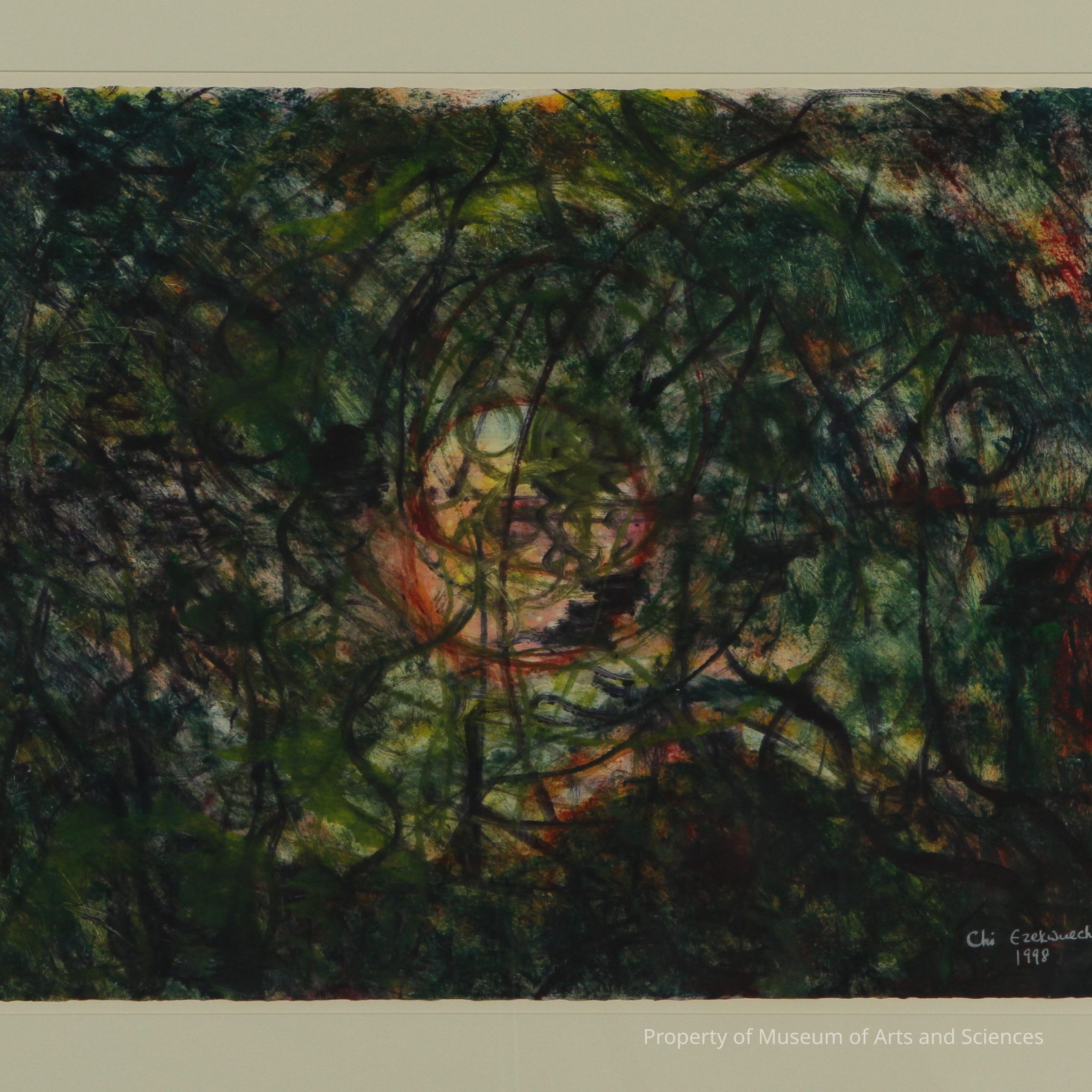 Ezekwueche's latest work explores the southern landscape. She observed that architectual elements or the land itself are seen through a screen of trees or vegetation. In this case, she captures a nightscape with the moon seen through trees and vines weaving a pattern through them.Artwork Details
