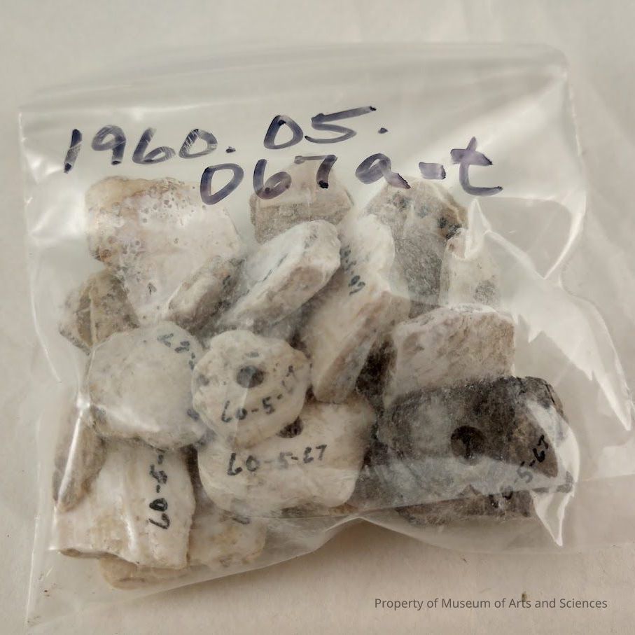 Mussel Shell beads. Group of twenty beads and bead blanks. Circular beads with cnetrally placed holes. Made from freshwater mussel shells of Kansas waters