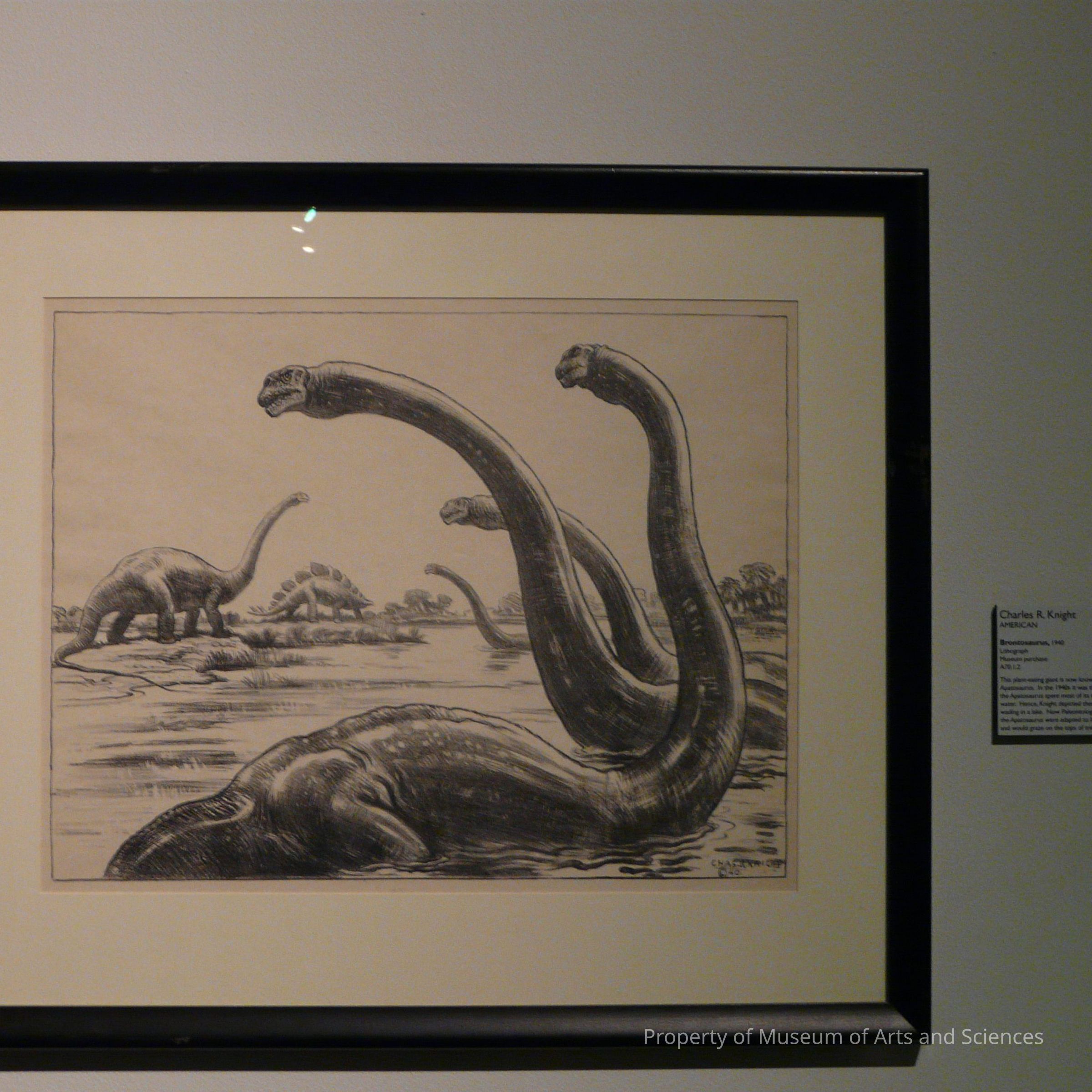 This plant-eating giant is now known as Apatosaurus. In the 1940s it was thought that the Apatosaurus spent most of its time in the water. Hence, Knight depicted these creatures wading in a lake. Now Paleontologists know that the Apatosaurus were adapted to living on land and would graze on the tops of trees.Collection