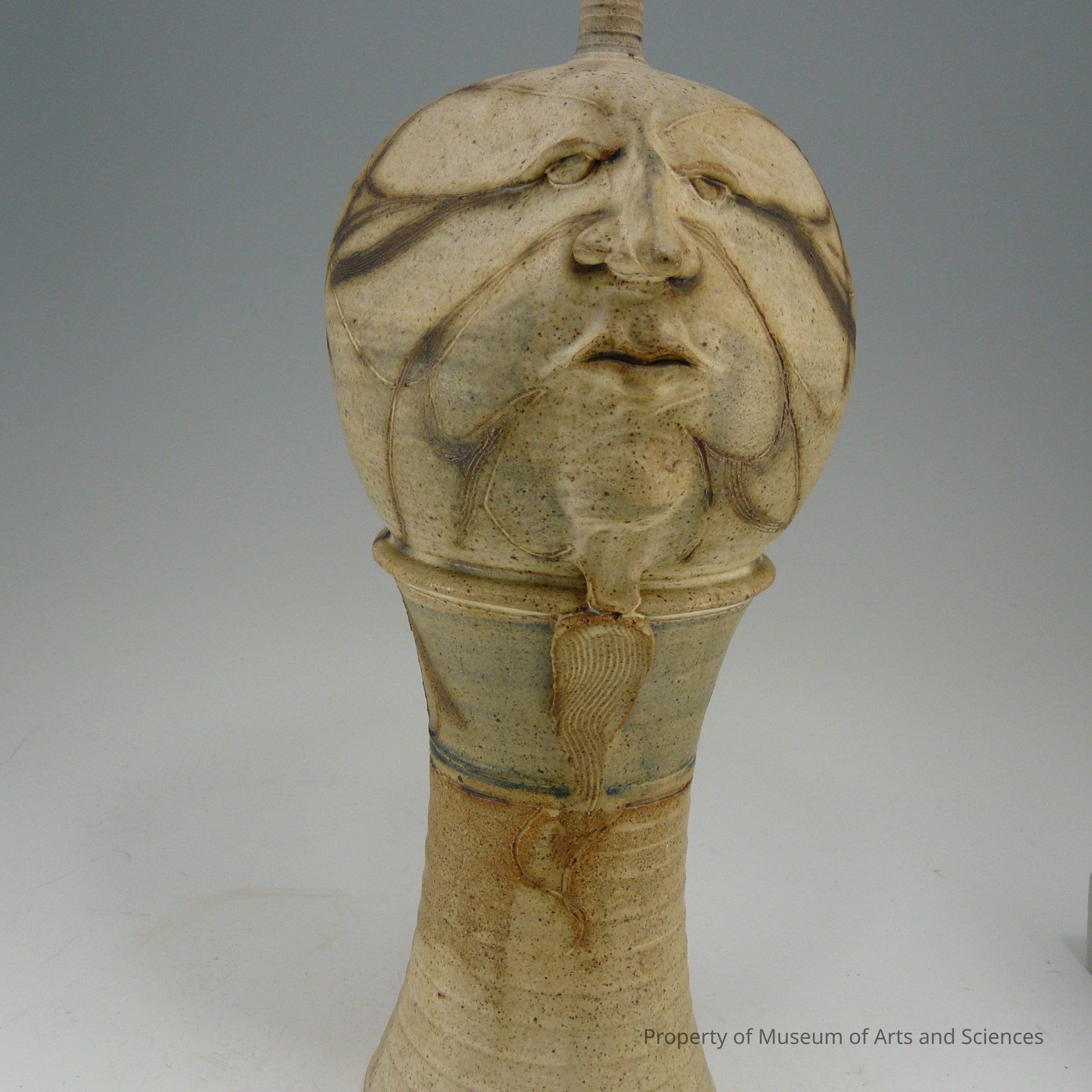 Tall jar-like sculpture with a face on each side. Base is tapered like a wineglass stem.