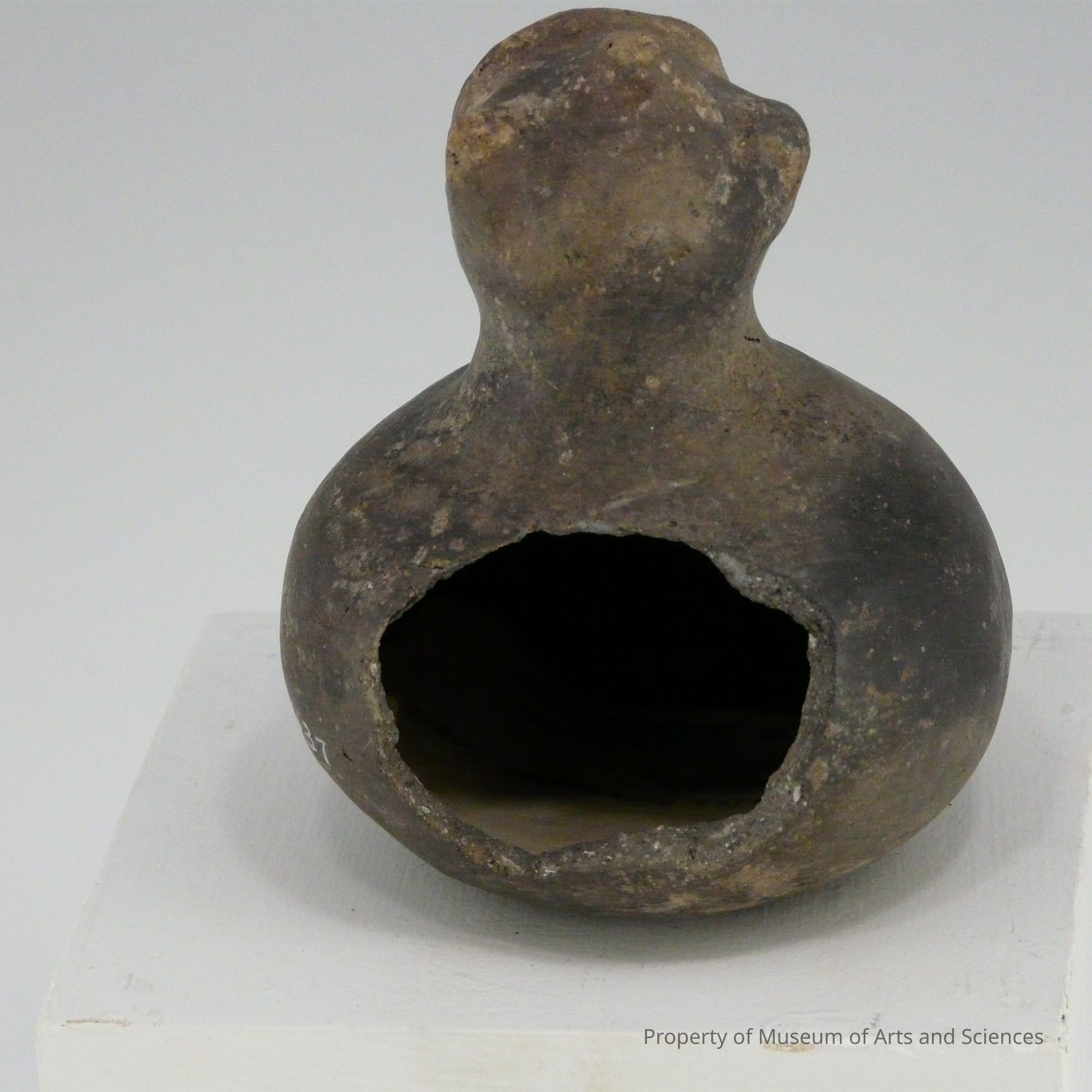 Bottle with ornamented mouth mound builders ceramic-hooded mouth effigy of owl Middle Mississippi Culture Catalogued by L. L. 3/30/60