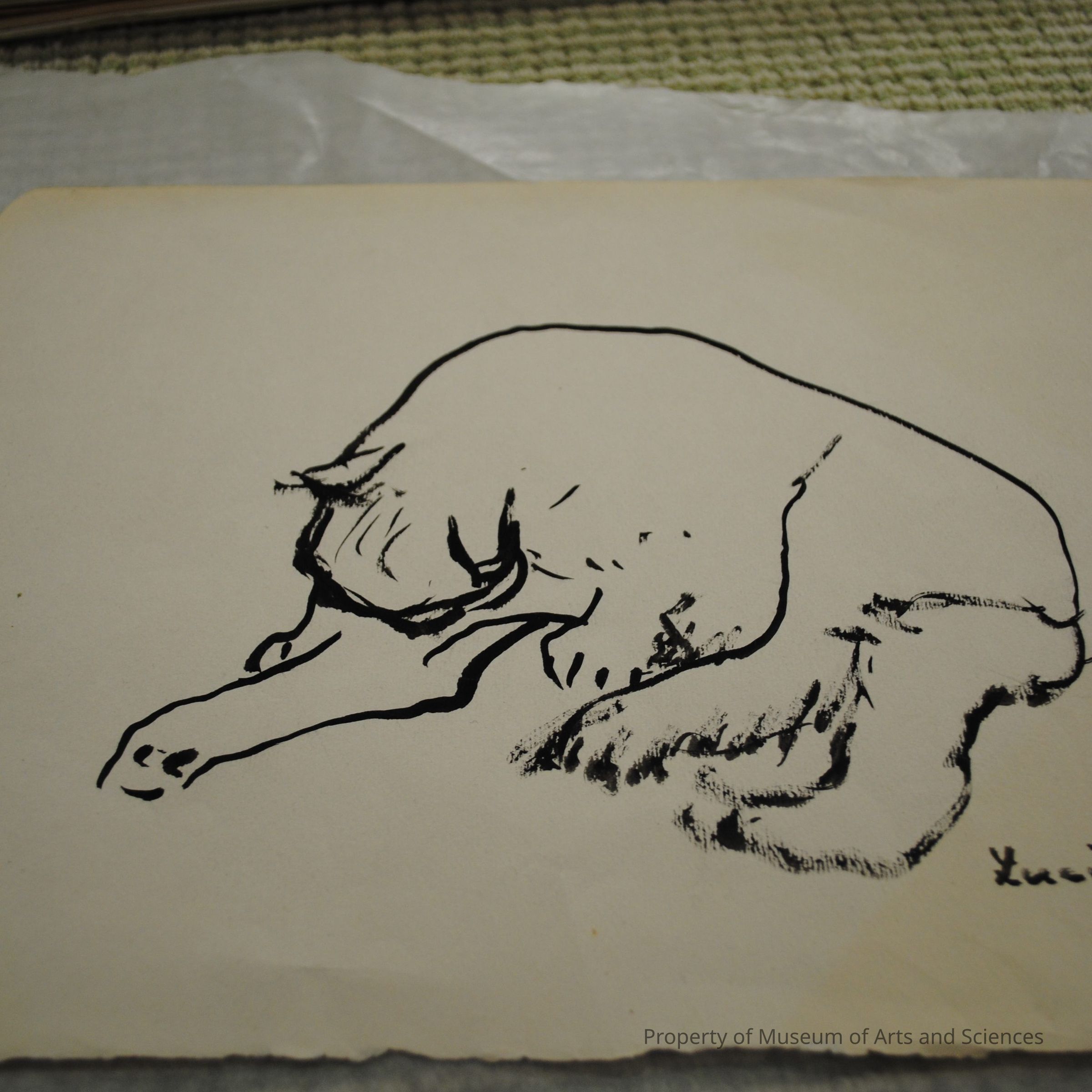 Ink drawing on paper of a large cat licking his paws. The cat takes up center of the image with a signature at the bottom right hand quadrant of the paper.Collection