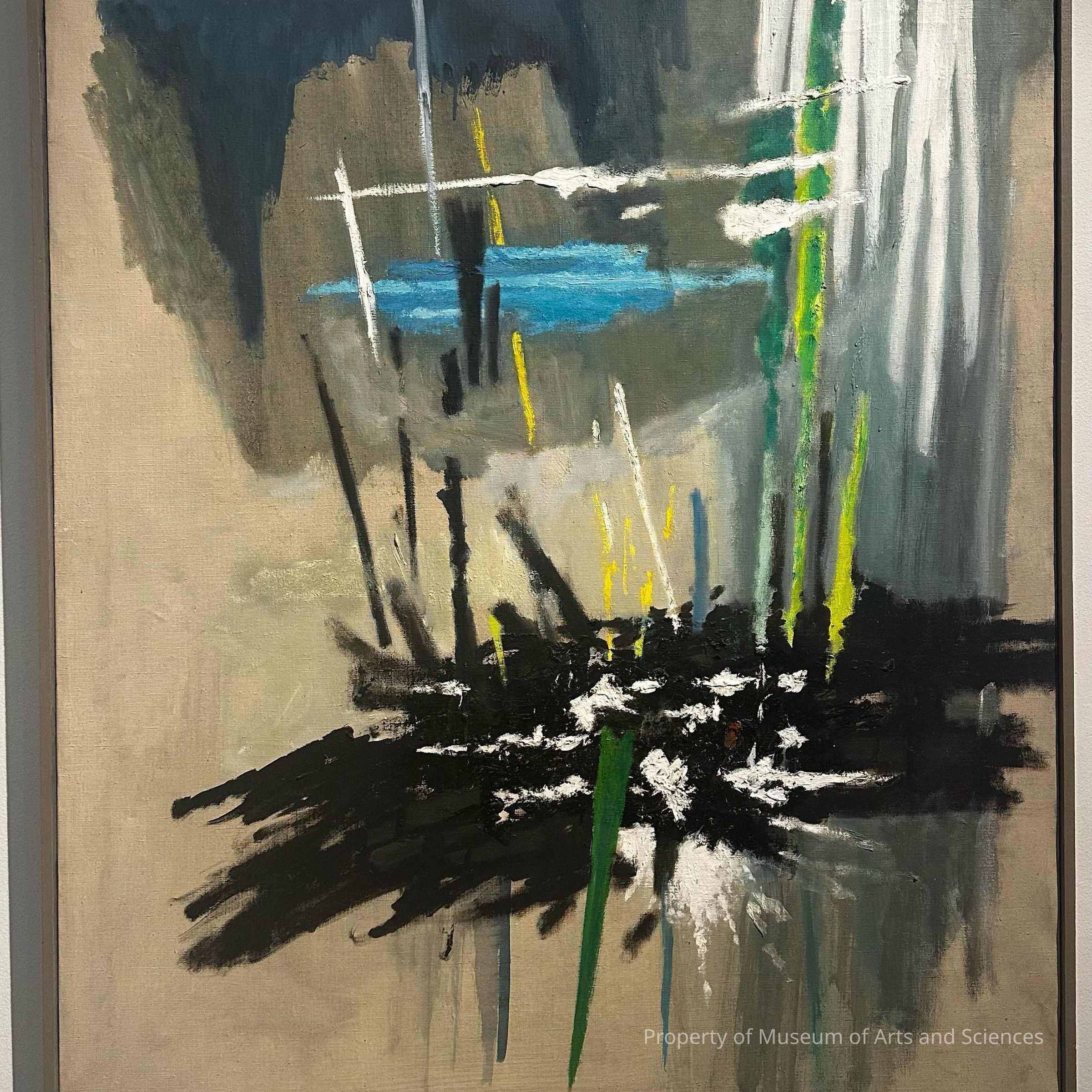 Non representational art: grey, blue, tan, black, green, yellow, white oil on canvas painting.Artwork Details