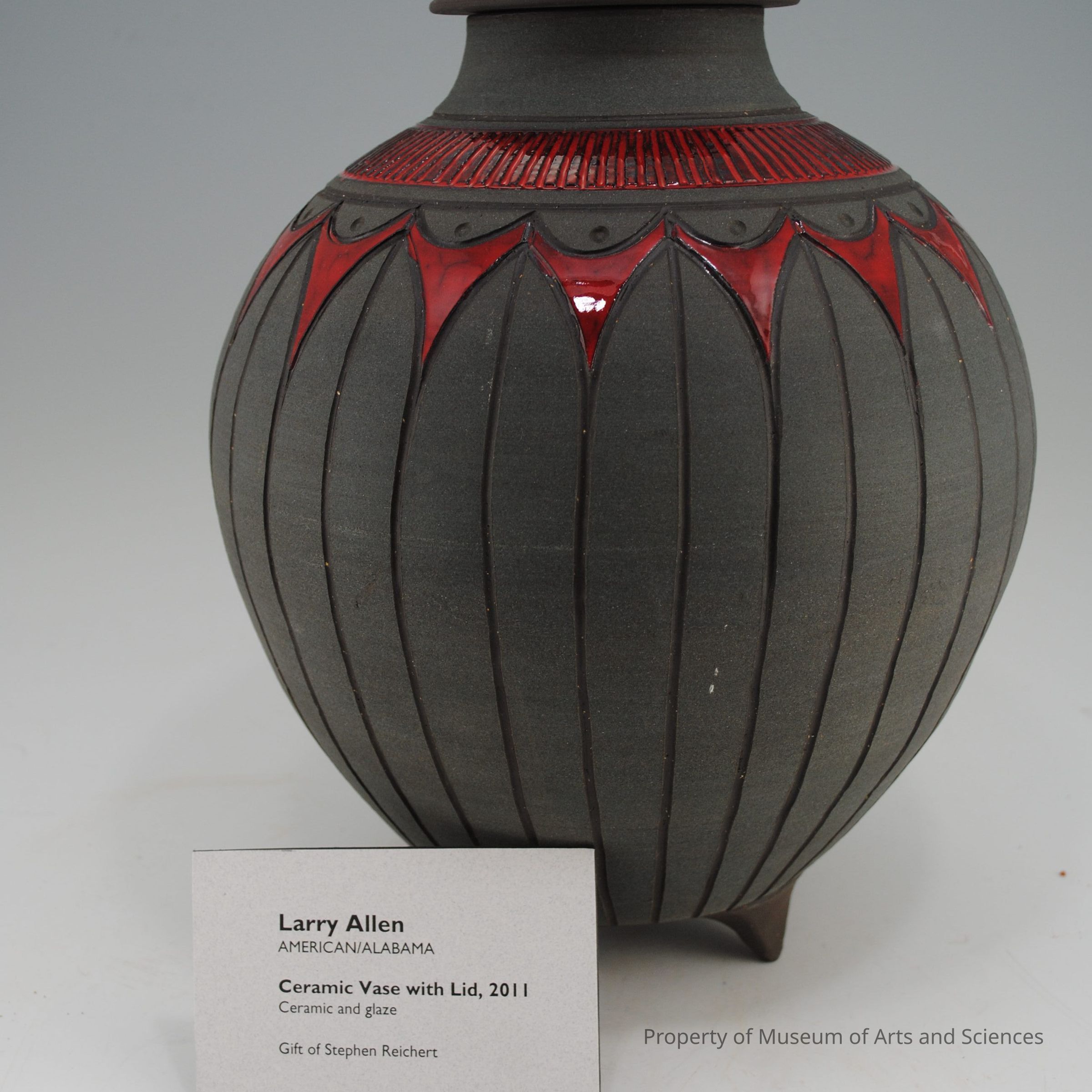 Red and black vase with red glazing on the lid and around the rim. The interior is glazed blue and black