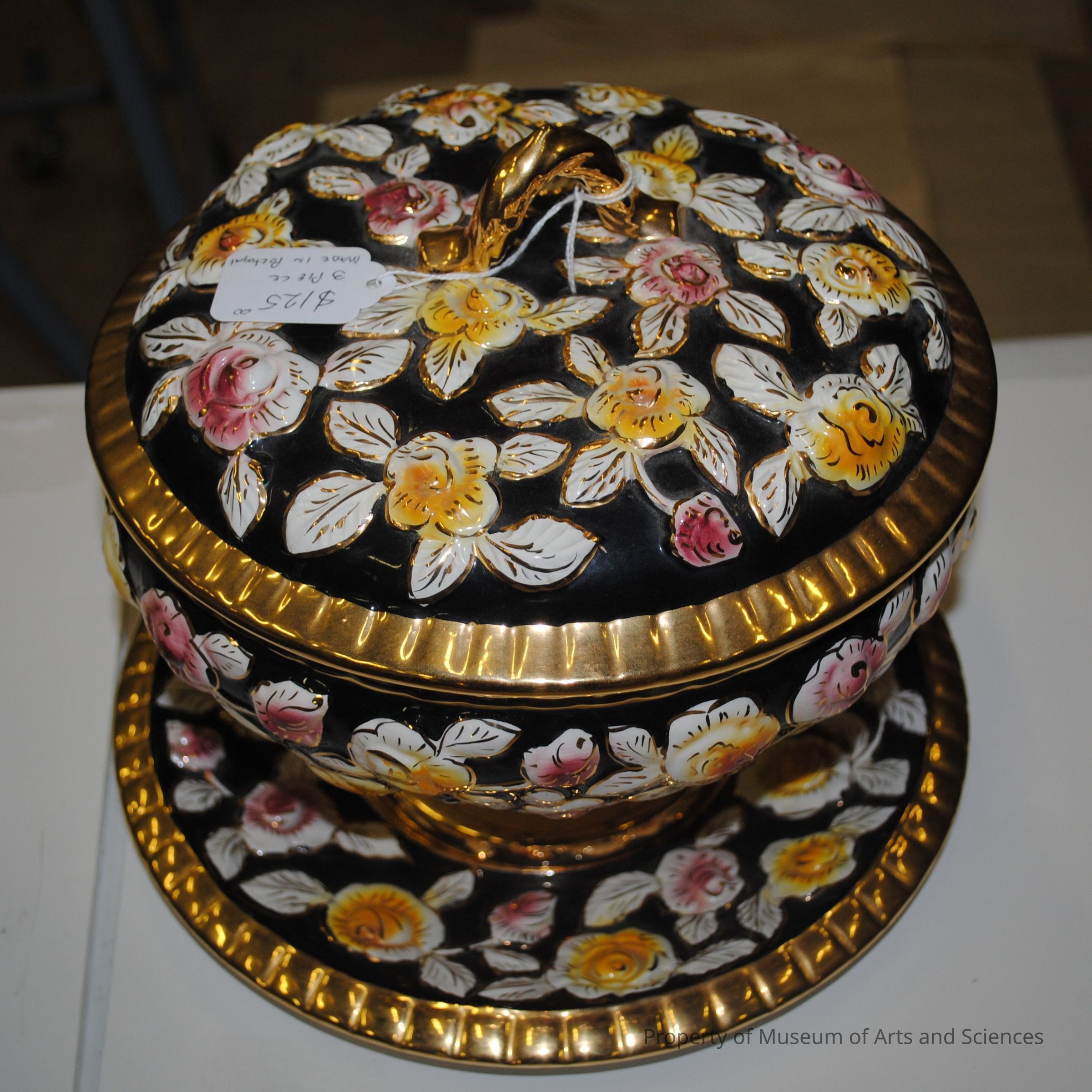 Glazed ceramic with pink, yellow, gold, and white on a black background. Bowl with lid and plate. Elpa PortugalCollection