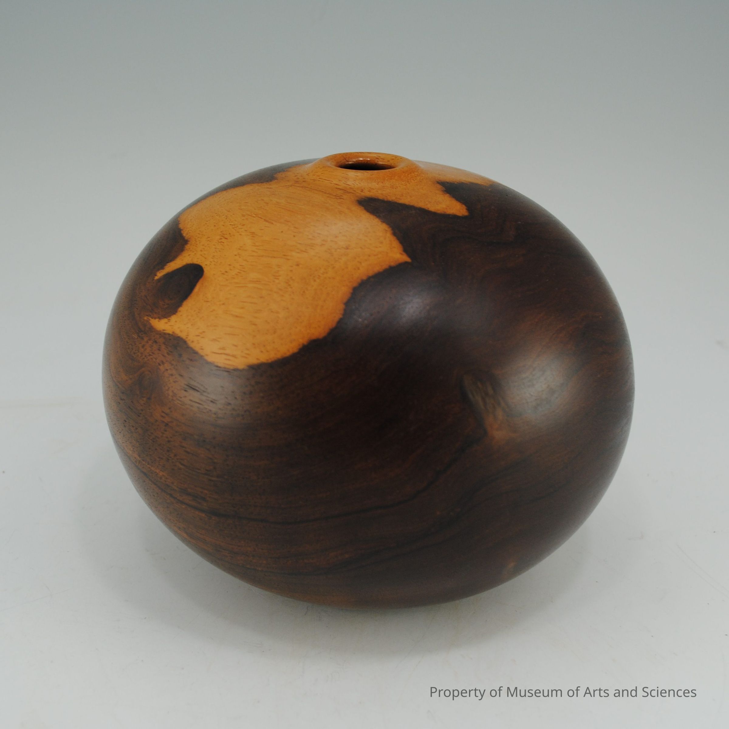 Hand carved Cocobolo Rosewood vessel in spherical form with slight raised round rim on lighter Rosewood top and dark field, signed, titled, and dated on the base incised.Artwork Details