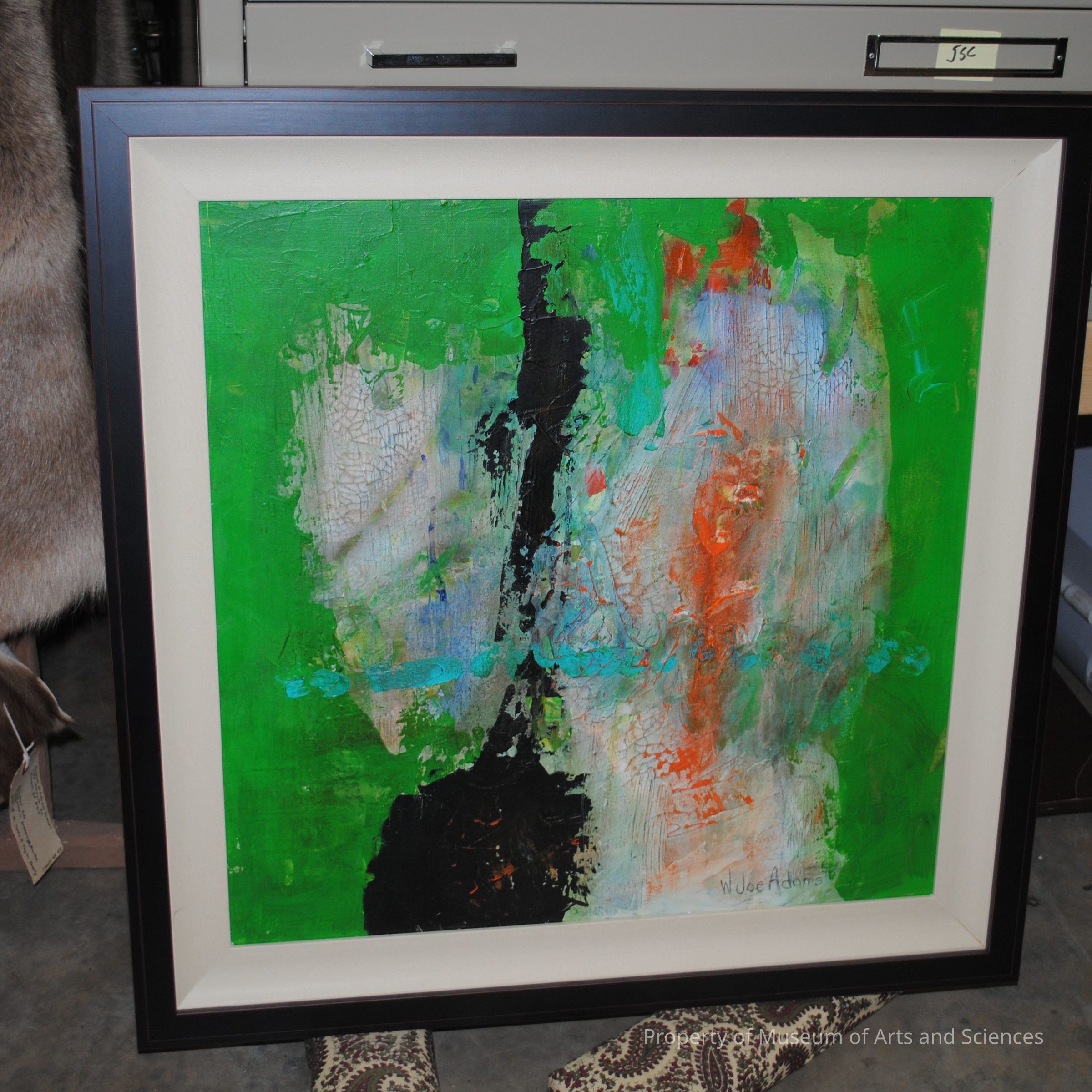 One framed orginal abstract painting measuring 30"x 30" (framed dimension) with green, vertical bands of black and orange, and horizontal teal band. Signed W. Joe Adams in lower right. Excellent Condition.Collection