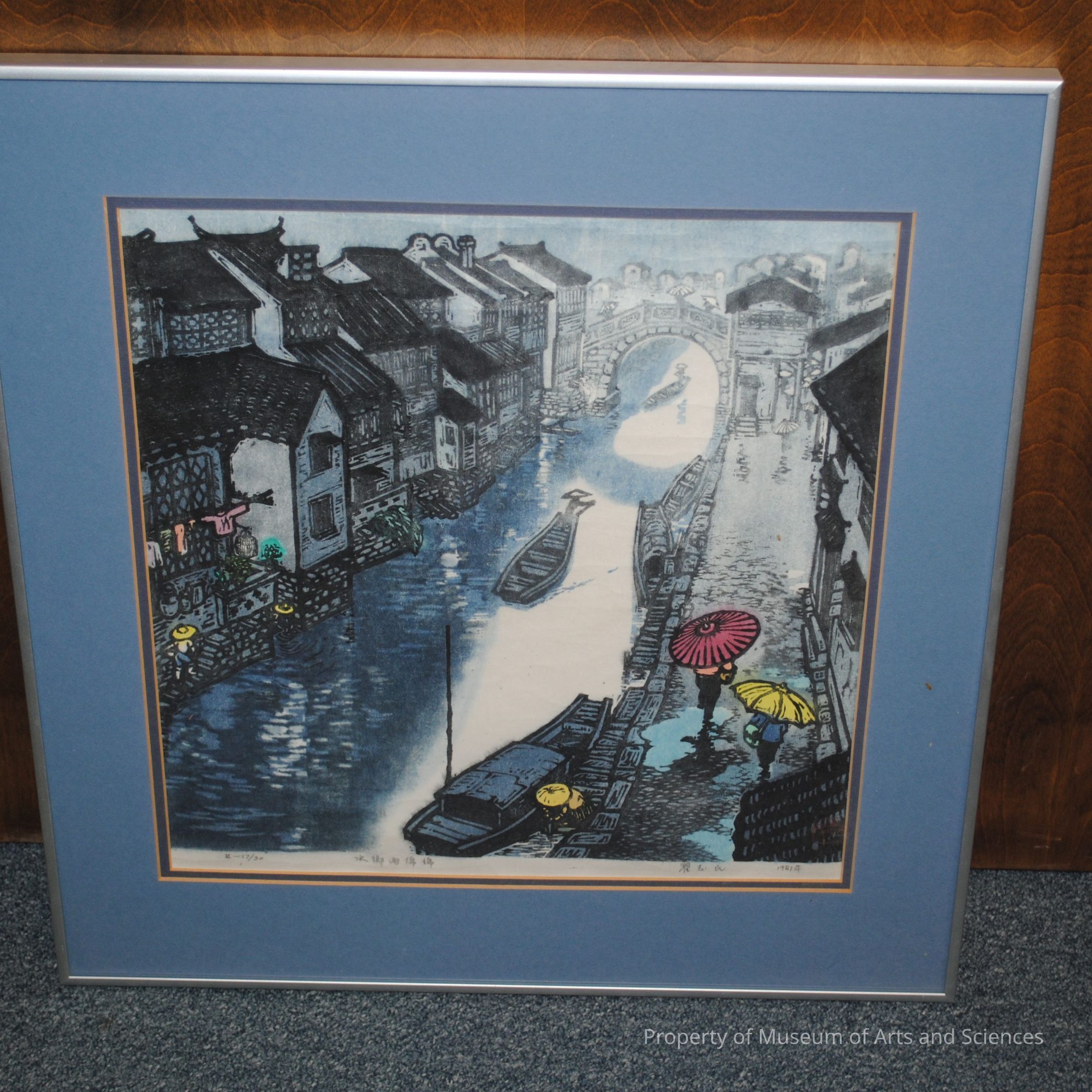 Chinese wood block print on cotton paper, framed, numbered #5 Translation: "A Rainy Day in a Watery Town" Signed Qú Zhi Míng From area south of Yangtze River