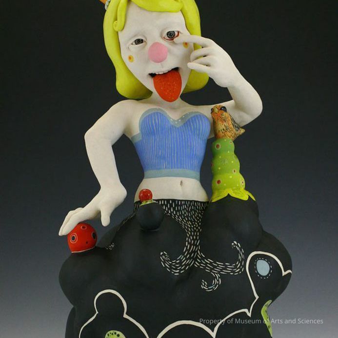 Figure looks female with one hand on side and other holding one eye open while sticking it's tounge out. The object itself is titled "Teasing"and is made of porcelain.Collection