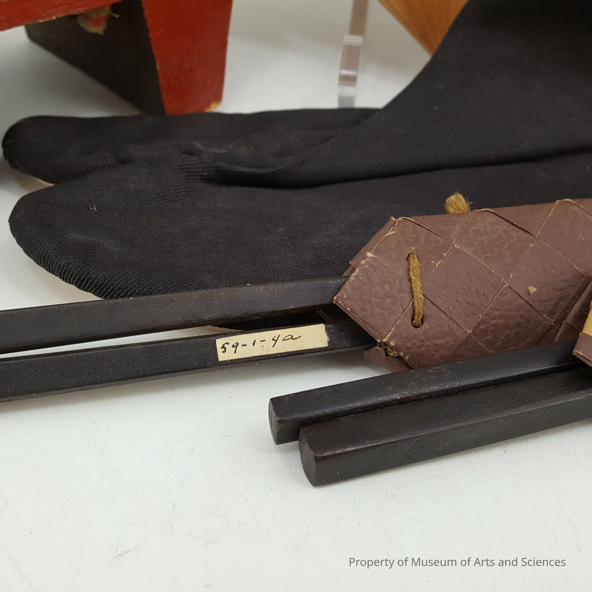 Color dark brown square & tapering to blunt point. Case brown, paper imitating leather in under & over basket weave LL Wooden-brown with basketweave case