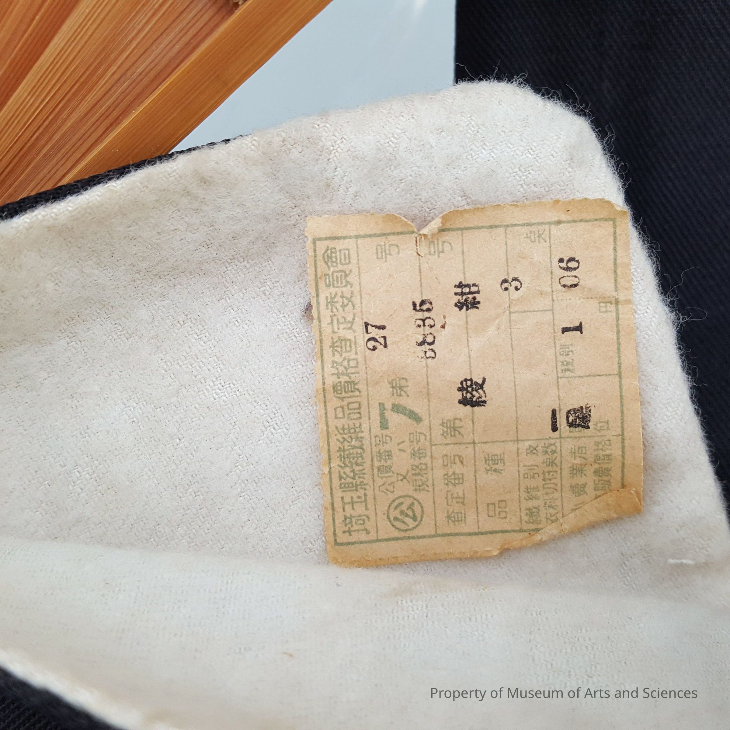 Black Cotton gabardine, lined inside with white flannel, sole of white cotton garbardine, 2 toes, comes just above ankles, Japanese 5 metal hooks as fastners at heel